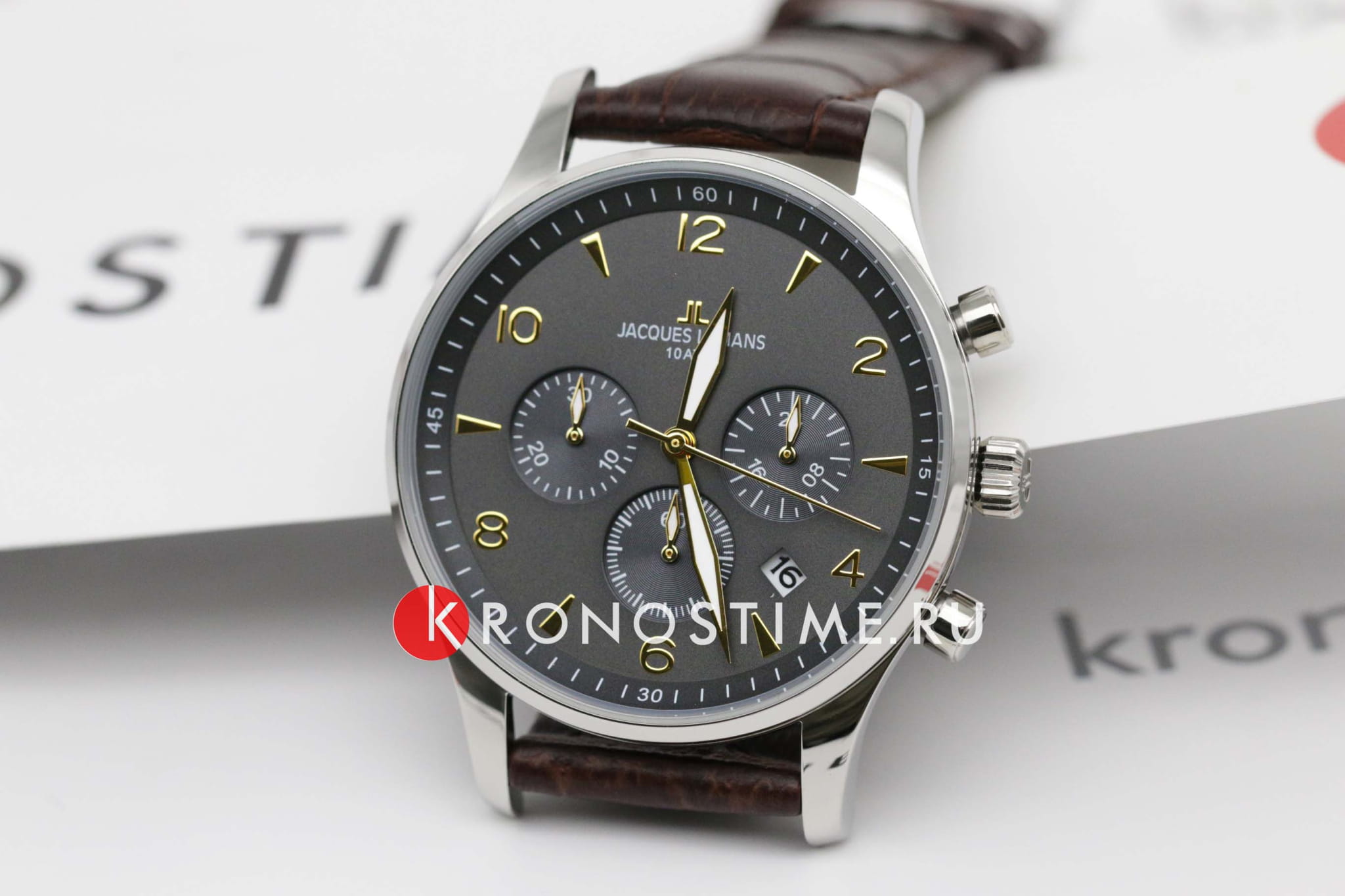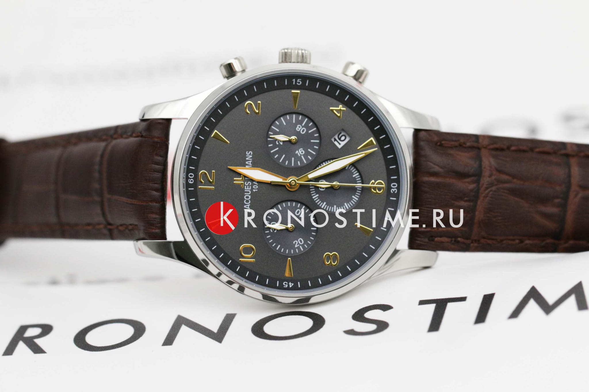 Австрийские мужские наручные часы c хронографомХронографФункция позволяет измерять отрезки времени с особой точностью: часы, минуты, секунды. Верным признаком хронографа является наличие на циферблате 3 дополнительных окошек-счётчиков. Jacques Lemans Classic 1-1654ZJ, кварцевый механизм с высокой точностью. Класс водозащиты: 100 метров, позволит плавать, нырять и заниматься другими водными видами спорта. Корпус часов изготовлен из стали. Четко структурированный серый циферблат привлекает сочетанием арабских цифр и рисок, а также дополнительными индикаторами даты, 24-х часов, 30-минутного накопителя и вынесенной секундной стрелки. В часах установлено ударопрочное минеральное стеклоМинеральное стеклоМинеральное стекло представляет собой искусственно выращенный минерал кварца. Такое стекло отличается особой устойчивостью к повреждениям и царапинам. Уступает по некоторым качествам сапфировому стеклу. Crystex. На темно-коричневом ремешке из натуральной кожи установлена застежка — пряжка.