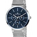 Стильно смотрится стальной браслет миланского плетения. На синем циферблате расположились симметричные функциональные счётчики. Кварцевый японский калибр Epson. Минеральное стекло со специальной закалкой. Водостойкость до 5 бар. Индикация числа и дня недели. Отображение времени в 12/24-х часовом формате.