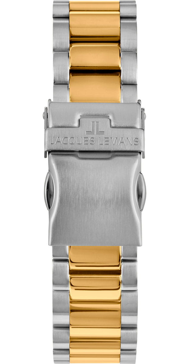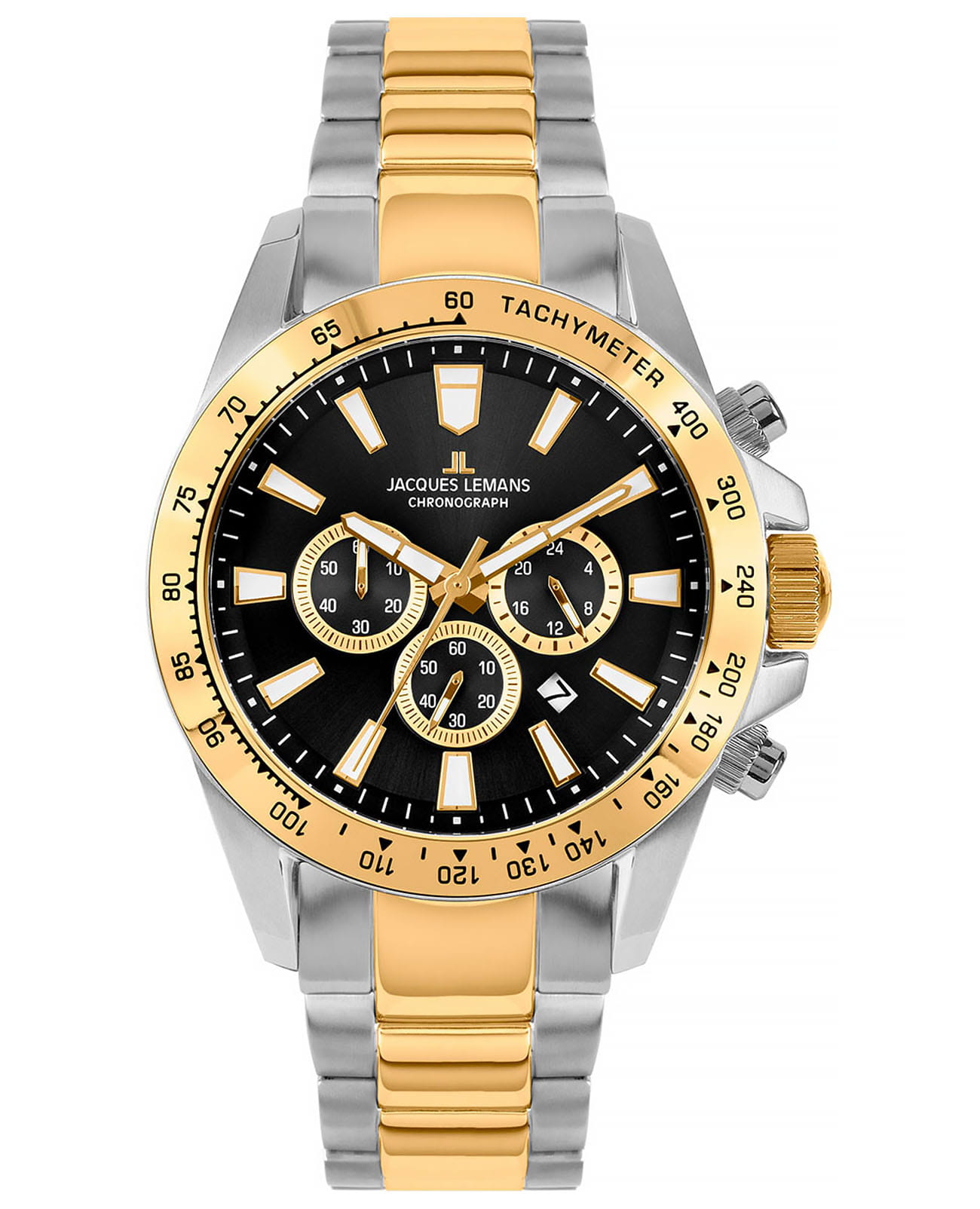 Кварцевый хронографХронографФункция позволяет измерять отрезки времени с особой точностью: часы, минуты, секунды. Верным признаком хронографа является наличие на циферблате 3 дополнительных окошек-счётчиков. в мощном корпусе диаметром 48 мм. Нержавеющая сталь с PVD-покрытиемPVDУльтратонкое покрытие наносится в технике вакуумного напыления, сочетает в себе нитрид титана особой прочности со слоем золота или оксида хрома. Несёт в себе декоративную или защитную функцию., из которой он сделан, отличается гипоаллергенными свойствами и стойкостью к коррозии. Широкий контрастный безельБезельВнешний ободок, закрепляющий стекло. В спортивных часах так называется поворотное кольцо с делениями на циферблате, выполняет роль таймера – замеряет отрезки времени на шкале. Неподвижный безель – элемент декора. Однонаправленно вращающийся безель на дайверских часах позволяет фиксировать моменты погружения и выныривания на поверхность. с тахиметрической шкалой обрамляет зеленый циферблат. На нем расположены три дополнительных индикатора и окошко даты. С помощью индикаторов можно засекать временные промежутки (секунды и минуты) и определять время в 24-часовом формате времяисчисления. В модели установлено минеральное стеклоМинеральное стеклоМинеральное стекло представляет собой искусственно выращенный минерал кварца. Такое стекло отличается особой устойчивостью к повреждениям и царапинам. Уступает по некоторым качествам сапфировому стеклу.. Повышенная водостойкость равна 10 атмосфер. Браслет из нержавеющей стали с частичным PVD-покрытиемPVDУльтратонкое покрытие наносится в технике вакуумного напыления, сочетает в себе нитрид титана особой прочности со слоем золота или оксида хрома. Несёт в себе декоративную или защитную функцию. удерживает на запястье раскладная застёжкаРаскладная застёжкаТакой тип застёжки используется только на браслетах из металла. Она никогда не раскрывается полностью, происходит разделение на 2 и более частей. Раскладывающая застёжка снизит вероятность потери часов к минимуму.. Часы Jacques Lemans, надежные и функциональные, хорошо дополнят образ в спортивном или повседневном стиле.