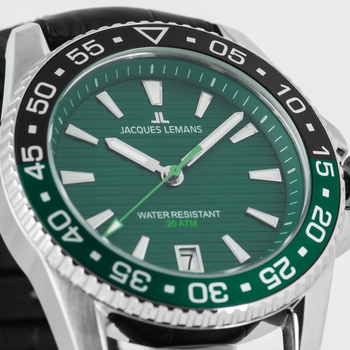 Мужские спортивные часы Jacques Lemans Liverpool Diver 1-2205C представляют собой стильный аксессуар, отражающий идеальное сочетание современного дизайна, надёжности и функциональности. Корпус из нержавеющей стали диаметром 41 мм идеально сбалансирован и элегантен. Ударопрочное минеральное стеклоМинеральное стеклоМинеральное стекло представляет собой искусственно выращенный минерал кварца. Такое стекло отличается особой устойчивостью к повреждениям и царапинам. Уступает по некоторым качествам сапфировому стеклу. Crystex защищает циферблат от царапин. Широкий безельБезельВнешний ободок, закрепляющий стекло. В спортивных часах так называется поворотное кольцо с делениями на циферблате, выполняет роль таймера – замеряет отрезки времени на шкале. Неподвижный безель – элемент декора. Однонаправленно вращающийся безель на дайверских часах позволяет фиксировать моменты погружения и выныривания на поверхность. с PVD-покрытиемPVDУльтратонкое покрытие наносится в технике вакуумного напыления, сочетает в себе нитрид титана особой прочности со слоем золота или оксида хрома. Несёт в себе декоративную или защитную функцию., на который вынесена дополнительная индикация секунд. Ремешок черного цвета состоит из двух частей: внутренняя сделана из силикона, материала, который не боится повышенной влажности, внешняя — из натуральной кожи. Водозащита 200 метров позволит плавать, нырять и заниматься другими водными видами спорта. Стрелки и метки с люминесцентным покрытиемЛюминесцентное покрытиеПозволяет считывать показания времени в темноте. Производители наносят на стрелки, часовые индексы, безель или поверхность циферблата светонакопительный состав, дающий холодное свечение. позволяющие легко определять время даже в темноте. Окошко даты находится в положении между 6 часов. Это аксессуар для мужчины, который ценит классический стиль и функциональность.