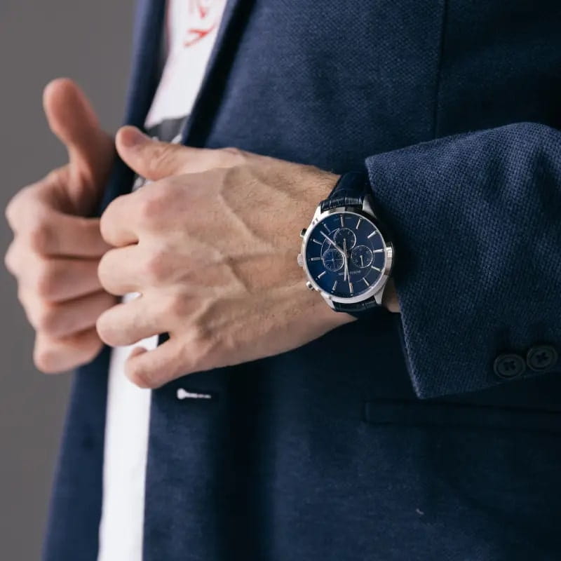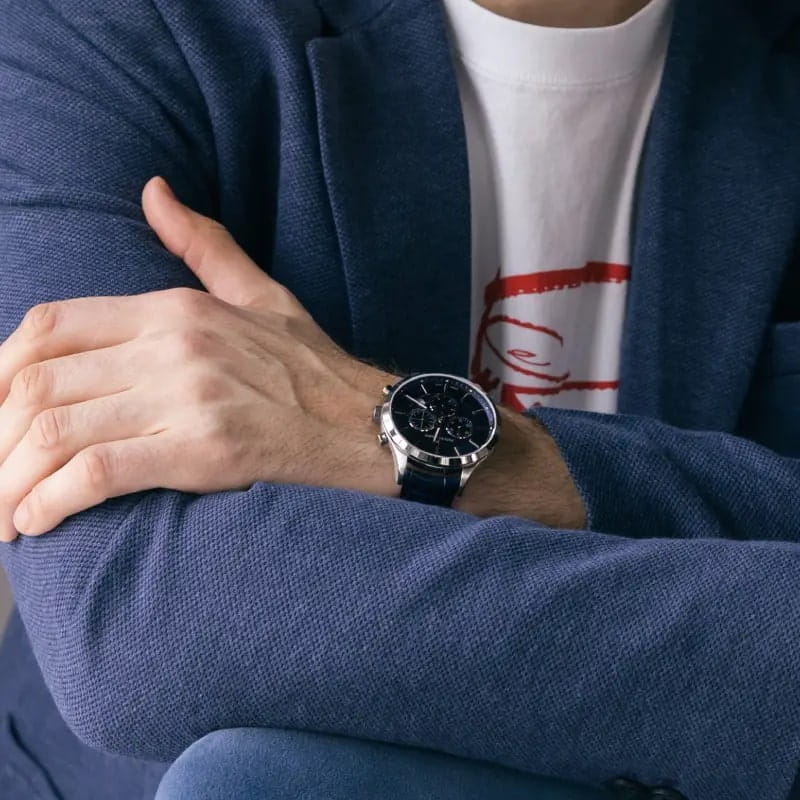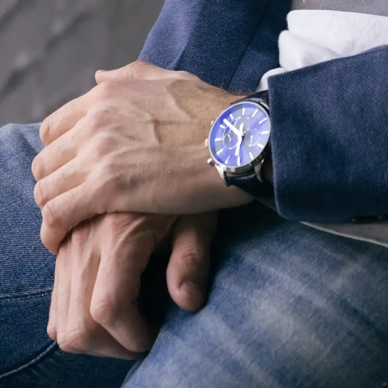 Водозащита 5 ATM защищает часы от брызг и дождя. Кожаный ремешок синего цвета с классической застёжкой обеспечивает комфортное ношение и надёжную фиксацию на запястье.