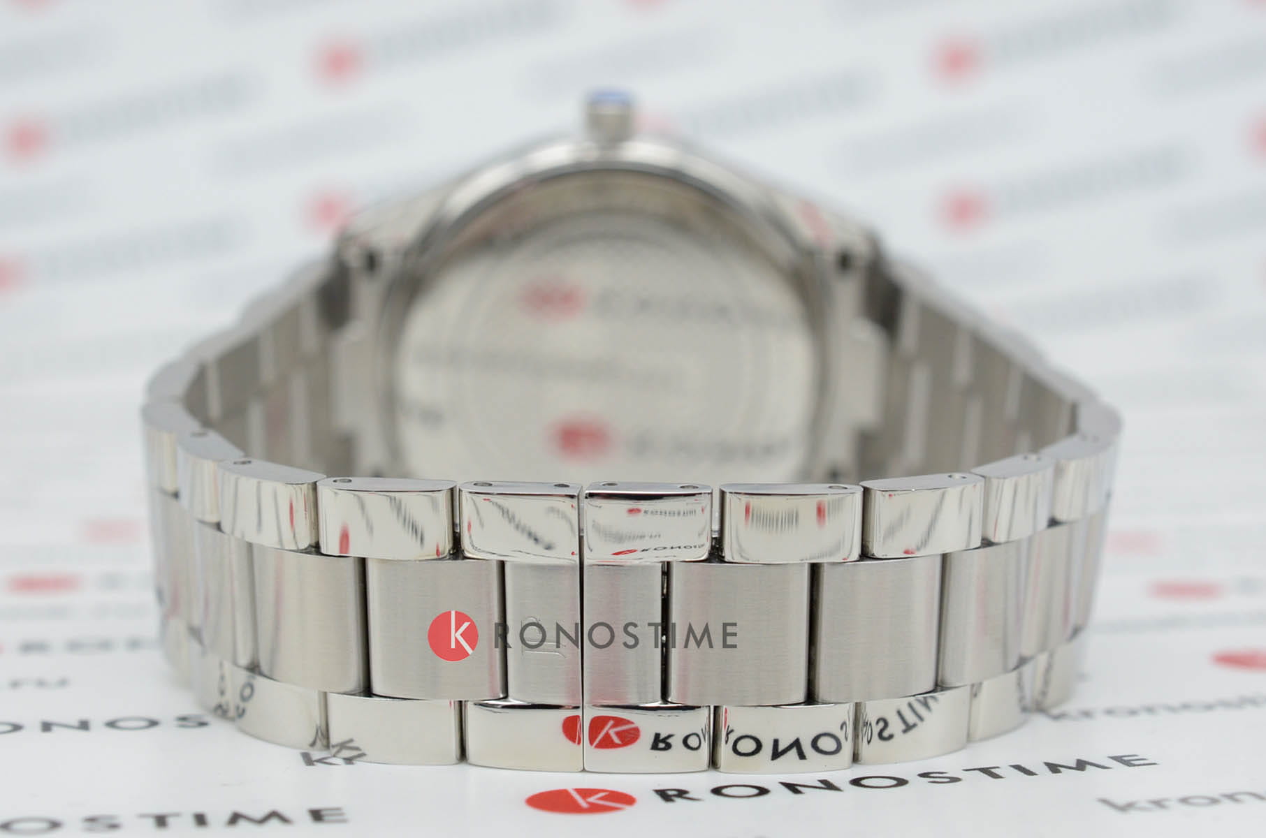 Стальной браслет на застёжке-бабочке с кнопкамиЗастёжка "бабочка"Такой вид застёжки дополняется предохранителями, помогающими избежать случайного раскрытия браслета. Обладают изящным исполнением. , который подчёркивает деловой характер модели и обеспечивает комфортную посадку на запястье. Водозащита до 100 ATM позволит плавать, нырять и заниматься другими водными видами спорта.
