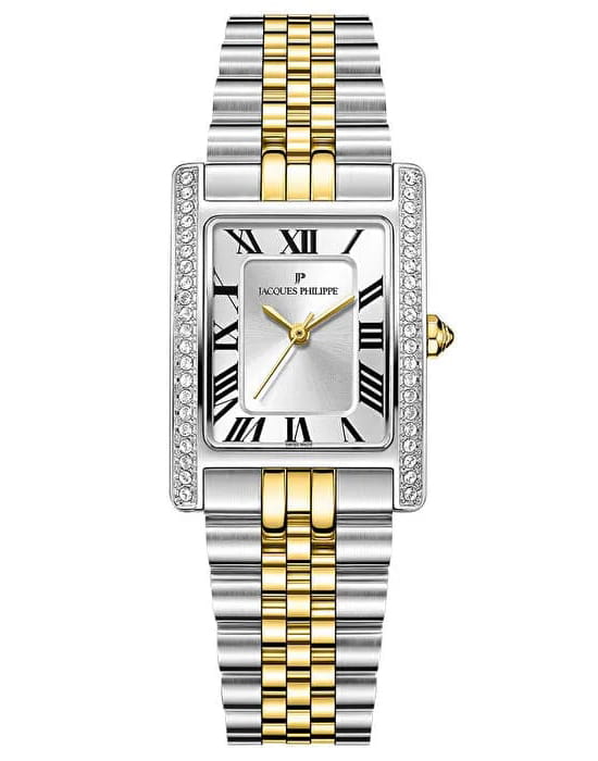 Часы Jacques Philippe JPQLS657328YGS из коллекции HORA — элегантные женские часы, сочетающие швейцарское качество и современный дизайн. Корпус диаметром 25 мм выполнен из нержавеющей стали, а белый циферблат защищён сапфировым стекломСапфировое стеклоПрочный и надёжный материал из кристалла сапфира синтетического происхождения, характеризующийся особой твёрдостью и устойчивостью к царапинам и повреждениям.. БезельБезельВнешний ободок, закрепляющий стекло. В спортивных часах так называется поворотное кольцо с делениями на циферблате, выполняет роль таймера – замеряет отрезки времени на шкале. Неподвижный безель – элемент декора. Однонаправленно вращающийся безель на дайверских часах позволяет фиксировать моменты погружения и выныривания на поверхность. инкрустирован кристаллами.