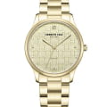 Женские кварцевые часы с минеральным стекломМинеральное стеклоМинеральное стекло представляет собой искусственно выращенный минерал кварца. Такое стекло отличается особой устойчивостью к повреждениям и царапинам. Уступает по некоторым качествам сапфировому стеклу. Kenneth Cole Dress Sport KCWLG2222701, кварцевый механизм с высокой точностью. Класс водозащиты: 30 метров, позволит защитить корпус от случайных брызг или капель дождя. Корпус и безельБезельВнешний ободок, закрепляющий стекло. В спортивных часах так называется поворотное кольцо с делениями на циферблате, выполняет роль таймера – замеряет отрезки времени на шкале. Неподвижный безель – элемент декора. Однонаправленно вращающийся безель на дайверских часах позволяет фиксировать моменты погружения и выныривания на поверхность. изготовлен из стали с IP-покрытиемIP-покрытиеМетод ионного напыления. Демонстрирует повышенную устойчивость к истиранию, окислению и химическим веществам. Под воздействием высокого давления и температуры около 1500°C молекулы металла надёжно соединяются с частицами корпуса часов.. Золотистый циферблат украшен бриллиантом. Стальной браслет на раскладной застёжкеРаскладная застёжкаТакой тип застёжки используется только на браслетах из металла. Она никогда не раскрывается полностью, происходит разделение на 2 и более частей. Раскладывающая застёжка снизит вероятность потери часов к минимуму..