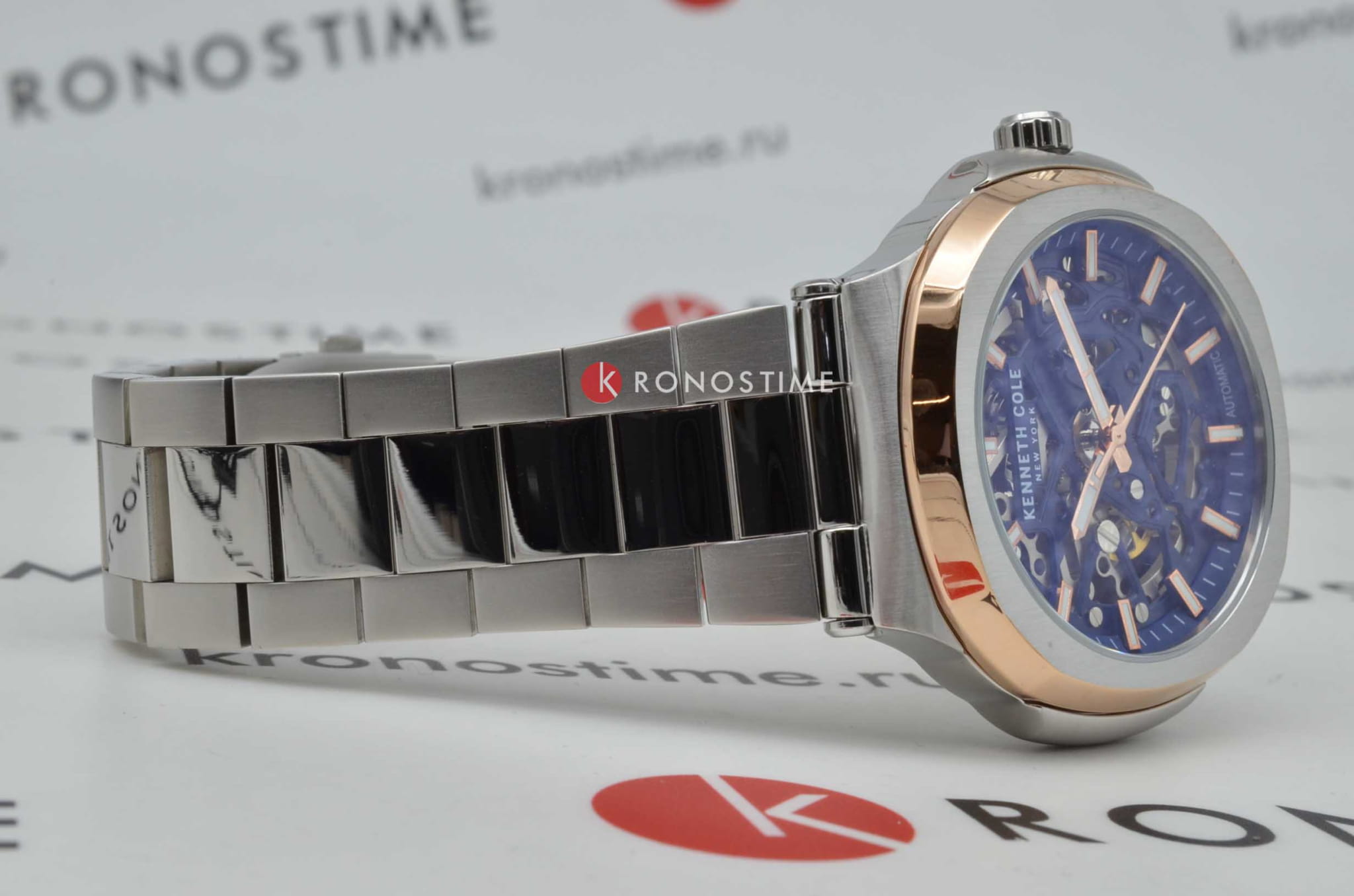 Мужские механические часы с автоподзаводом Kenneth Cole KCWGY0046201 — это выразительный аксессуар, сочетающий современный дизайн и инженерную изысканность. Корпус размером 44 мм выполнен из нержавеющей стали. Безель с частичным IP-покрытиемIP-покрытиеМетод ионного напыления. Демонстрирует повышенную устойчивость к истиранию, окислению и химическим веществам. Под воздействием высокого давления и температуры около 1500°C молекулы металла надёжно соединяются с частицами корпуса часов. розового золота и стального цвета. Циферблат синего цвета частично скелетонизирован, что позволяет наблюдать за работой механизма, добавляя модели динамики и технологичности. Циферблат защищён минеральным стекломМинеральное стеклоМинеральное стекло представляет собой искусственно выращенный минерал кварца. Такое стекло отличается особой устойчивостью к повреждениям и царапинам. Уступает по некоторым качествам сапфировому стеклу. и оформлен метками в виде штрихов. Стрелки и метки оснащены люминесцентным покрытиемЛюминесцентное покрытиеПозволяет считывать показания времени в темноте. Производители наносят на стрелки, часовые индексы, безель или поверхность циферблата светонакопительный состав, дающий холодное свечение., обеспечивающим хорошую читаемость в темноте. Часы оснащены стальным браслетом с раскладной застёжкойРаскладная застёжкаТакой тип застёжки используется только на браслетах из металла. Она никогда не раскрывается полностью, происходит разделение на 2 и более частей. Раскладывающая застёжка снизит вероятность потери часов к минимуму.. Водонепроницаемость 30 м позволяет использовать часы в повседневных условиях, защищая от случайных брызг и капель дождя. Сочетание строгого стиля и детального исполнения делает эти часы заметным элементом образа.