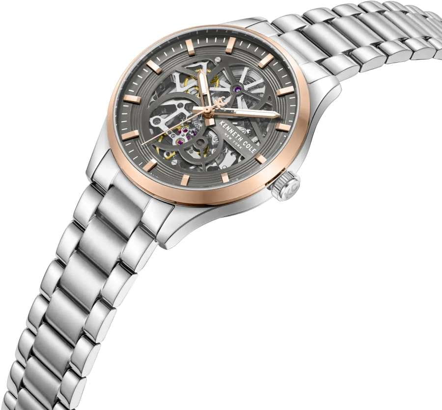 Мужские механические часы с автоподзаводом Kenneth Cole — это выразительный и элегантный аксессуар. Корпус диаметром 42 мм выполнен из нержавеющей стали 316L. БезельБезельВнешний ободок, закрепляющий стекло. В спортивных часах так называется поворотное кольцо с делениями на циферблате, выполняет роль таймера – замеряет отрезки времени на шкале. Неподвижный безель – элемент декора. Однонаправленно вращающийся безель на дайверских часах позволяет фиксировать моменты погружения и выныривания на поверхность. из нержавеющей стали с IP-покрытиемIP-покрытиеМетод ионного напыления. Демонстрирует повышенную устойчивость к истиранию, окислению и химическим веществам. Под воздействием высокого давления и температуры около 1500°C молекулы металла надёжно соединяются с частицами корпуса часов.. Циферблат серого цвета оформлен в стиле скелетон, что позволяет наблюдать за работой механизма. Циферблат защищён минеральным стекломМинеральное стеклоМинеральное стекло представляет собой искусственно выращенный минерал кварца. Такое стекло отличается особой устойчивостью к повреждениям и царапинам. Уступает по некоторым качествам сапфировому стеклу.. Механизм — автоматический с функцией подзавода от движения руки. Часы оснащены стальным браслетом на раскладной застёжкеРаскладная застёжкаТакой тип застёжки используется только на браслетах из металла. Она никогда не раскрывается полностью, происходит разделение на 2 и более частей. Раскладывающая застёжка снизит вероятность потери часов к минимуму.. Водонепроницаемость 30 м позволяет использовать часы в повседневных условиях. Идеальный выбор для тех, кто ценит стиль, технологии и американское качество.