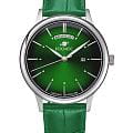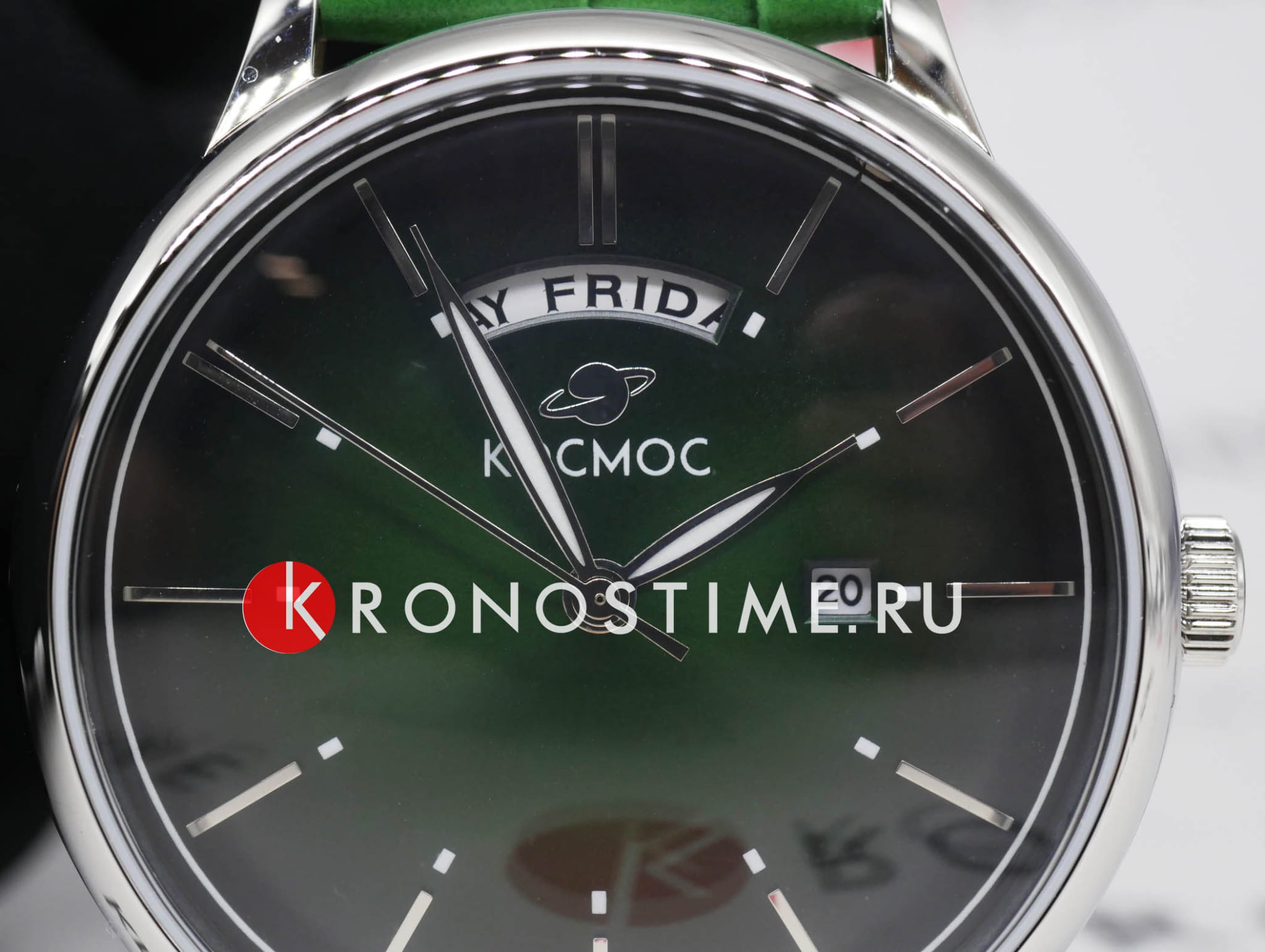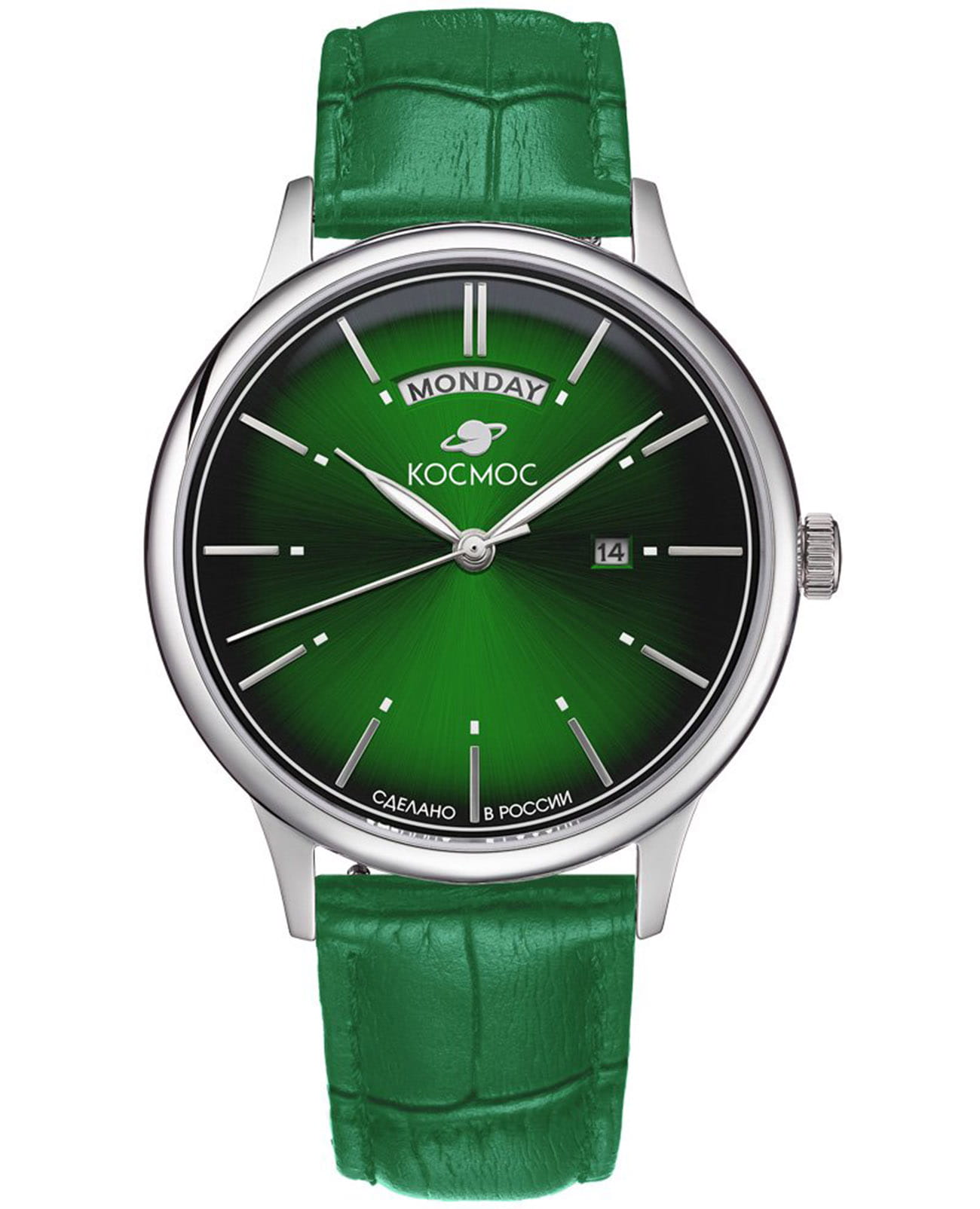 Мужские наручные часы Космос Орион K 011.17.38 — это сочетание традиций часового искусства 60-70-х годов и футуристического дизайна, вдохновленного космическими исследованиями. Они не только служат напоминанием о прошлом, но и побуждают задуматься о будущем, позволяя наслаждаться качеством и смыслом, вложенными в каждую деталь. Полированный корпус часов выполнен в виде силуэта летающей тарелки благодаря выпуклым формам стекла и нижней части корпуса. Стальные ушки, которые напоминают опоры летающей тарелки, завершает общий образ. На задней крышке часов выгравирован фантазийный сюжет – космическая станция будущего. Зеленый циферблат, выполненный в ретро-стиле, имеет выгнутые края, что требует использования сложной технологии производства. Такой дизайн был характерен для часов прошлых эпох. Секундная стрелка, имеющая изогнутую форму, идеально соответствует контуру циферблата. Выпуклый градиентный циферблат с шлифовкой, напоминающей солнечные лучи, украшен вручную изготовленными индексами, которые надежно крепятся на двух штифтах. Часовая и минутная стрелки, а также линия по краю циферблата, напоминающая ореол Земли, имеют люминесцентное покрытиеЛюминесцентное покрытиеПозволяет считывать показания времени в темноте. Производители наносят на стрелки, часовые индексы, безель или поверхность циферблата светонакопительный состав, дающий холодное свечение., которое светится в темноте, создавая впечатляющий визуальный эффект. В верхней части циферблата расположено окошко для отображения дня недели на английском языке, а индикаторы даты и дня недели дополнительно украшены фасочками, что придает им элегантный вид. Форма минерального стеклаМинеральное стеклоМинеральное стекло представляет собой искусственно выращенный минерал кварца. Такое стекло отличается особой устойчивостью к повреждениям и царапинам. Уступает по некоторым качествам сапфировому стеклу. также тщательно продумана, оно изогнуто как снаружи, так и изнутри. Это позволяет избежать искажений изображения на циферблате, в отличие от традиционного стекла с прямой внутренней частью, создающего эффект линзы. Ремешок из натуральной кожи зеленого цвета прекрасно дополняет часы. Также имеется возможность приобрести дополнительные ремни и браслеты миланского плетения, которые можно легко менять благодаря специальным крепежам. Заводная головка, застежка и ремешок украшены фирменным логотипом, подчеркивающим индивидуальность и стиль модели.