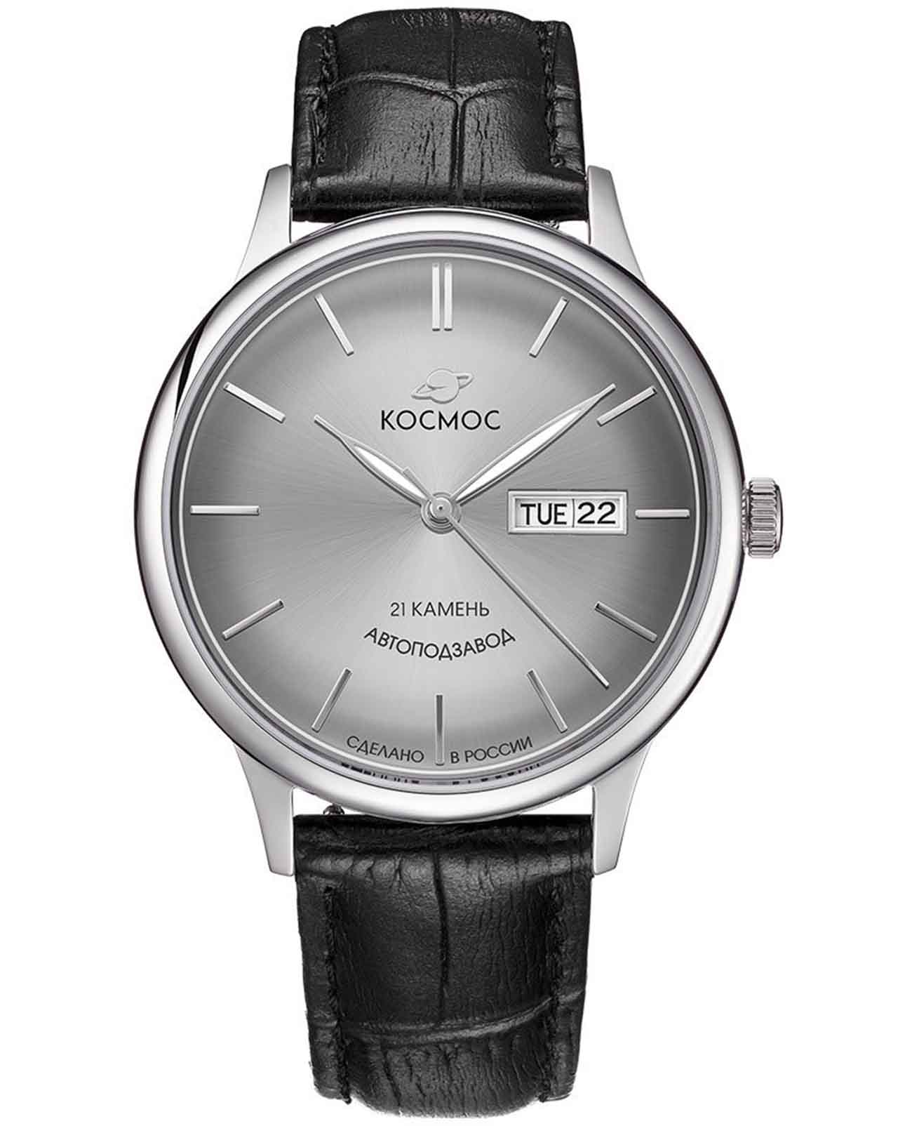 Российские мужские механические часы Космос K 043.11.33 с автоподзаводом оснащены корпусом из нержавеющей стали 316L диаметром 41 мм и защищены минеральным стекломМинеральное стеклоМинеральное стекло представляет собой искусственно выращенный минерал кварца. Такое стекло отличается особой устойчивостью к повреждениям и царапинам. Уступает по некоторым качествам сапфировому стеклу.. Серебряный циферблат дополнен функциями отображения даты и дня недели. Стрелки с люминесцентным покрытиемЛюминесцентное покрытиеПозволяет считывать показания времени в темноте. Производители наносят на стрелки, часовые индексы, безель или поверхность циферблата светонакопительный состав, дающий холодное свечение. обеспечивают хорошую видимость в темное время суток. Заводная головка декорирована логотипом бренда в виде стилизованного изображения планеты. Часы имеют водонепроницаемость 50 метров, позволит защитить корпус от случайных брызг или капель дождя. Модель комплектуется ремешком из натуральной кожи на стандартной застежке. Прочный корпус и надежный механизм делают эти часы универсальным аксессуаром для повседневного использования. Уникальный дизайн и высокое качество материалов подчеркивают индивидуальность владельца. Специальные крепежи позволяют легко заменить браслет на часах самостоятельно.