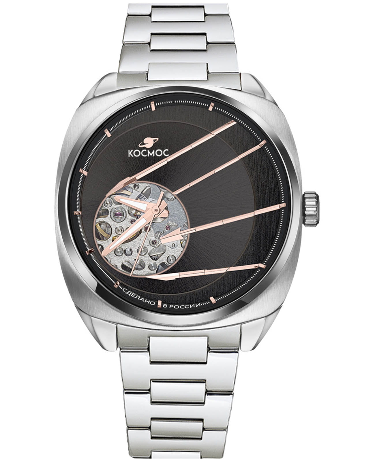 Мужские наручные часы Космос Спутник K 115.10.34 — это уникальная лимитированная серия, созданная в честь исторического запуска первого искусственного спутника Земли. В корпусе необычной круглой формы, выполненном из гипоаллергенной нержавеющей стали 316L, работает надежный механический механизм с автоподзаводом от японской компании Seiko. Прозрачная задняя крышка, закрепленная на четырех винтах, открывает вид на сложный механизм, а на самой крышке указан индивидуальный номер модели в формате хх/50. Скелетонизированный черный циферблат защищен сапфировым стекломСапфировое стеклоПрочный и надёжный материал из кристалла сапфира синтетического происхождения, характеризующийся особой твёрдостью и устойчивостью к царапинам и повреждениям. с антибликовым покрытием, которое обеспечивает максимальную устойчивость к царапинам и идеальную видимость в любых условиях. Украшением циферблата служат крупные стрелки с люминесцентным покрытиемЛюминесцентное покрытиеПозволяет считывать показания времени в темноте. Производители наносят на стрелки, часовые индексы, безель или поверхность циферблата светонакопительный состав, дающий холодное свечение., а также специальная апертура, окаймленная элементами, напоминающими антенны Спутника. Часовая и минутная стрелки отлично читаются благодаря своему размеру и светящемуся покрытию. Браслет литой конструкции из нержавеющей стали дополнен удобной застежкой-бабочкой с двумя боковыми кнопкамиЗастёжка "бабочка"Такой вид застёжки дополняется предохранителями, помогающими избежать случайного раскрытия браслета. Обладают изящным исполнением. , что гарантирует надежную фиксацию на руке. Водозащита до 10 атм (WR100) позволяет использовать часы при плавании и других водных видах спорта без акваланга. Коллекция Спутник — это выбор для ценителей истории космических достижений и современных технологий.