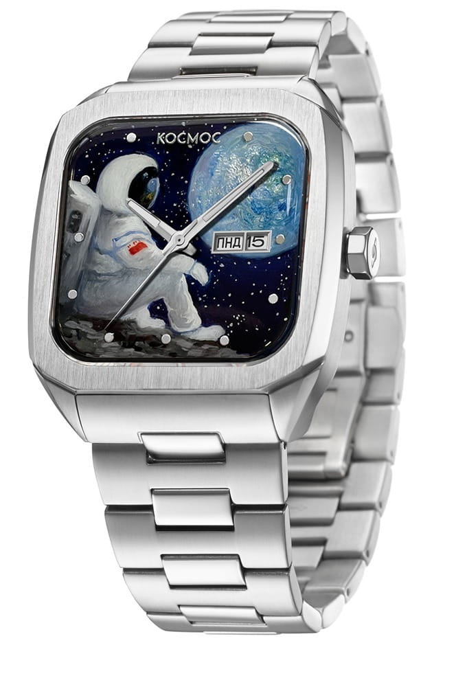 Мужские наручные часы Космос К 213.10 - Космический мечтатель — это уникальная модель. «Будущее человечества в Космосе!» - считал знаменитый ученый Константин Циолковский. Но «колыбель человечества», Земля, всегда останется предметом мечтания любого космонавта, в какой точке космоса он бы не находился. Так и герой фантазийного сюжета на циферблате часов неотрывно смотрит на нашу планету, несравнимо прекрасную и бесконечно родную. Для создания этой уникальной модели часов мастера бренда выбрали технику лаковой миниатюры. На основу наносится несколько слоев лака и краски, их чередование создает объемный эффект и ощущение движения. Процесс постепенной прорисовки деталей довольно длительный: художнику требуется до 50 часов для завершения одного сюжета. Затем миниатюра запекается в специальной печи, что придаёт рисунку необходимую яркость и завершенность. Эти часы созданы в единственном экземпляре. В часах установлен механизм TMI с функцией автоподзавода. Они показывают часы, минуты и секунды, а также дату и день недели, индикатор которых с накладной рамкой расположен в положении «3 часа». За движением деталей механизма можно наблюдать, стоит только перевернуть часы: задняя крышка прозрачная, закреплена на 4-х винтах. Часовая и минутная стрелки c люминесцентным покрытиемЛюминесцентное покрытиеПозволяет считывать показания времени в темноте. Производители наносят на стрелки, часовые индексы, безель или поверхность циферблата светонакопительный состав, дающий холодное свечение., которое светится в темноте. В модели установлено сапфировое стеклоСапфировое стеклоПрочный и надёжный материал из кристалла сапфира синтетического происхождения, характеризующийся особой твёрдостью и устойчивостью к царапинам и повреждениям. с антибликовым покрытиемАнтибликовое покрытиеСлой оксида металла в 0,13-0,3 микрон, благодаря которому стекло часов не бликует и не отражает свет. Антибликовое покрытие уменьшает отражение света в 10 раз, обеспечивая отличную читаемость показателей циферблата.. Браслет собран из стальных звеньев с полировкой, удобная и надежная застежка-клипса украшена логотипом бренда Космос.