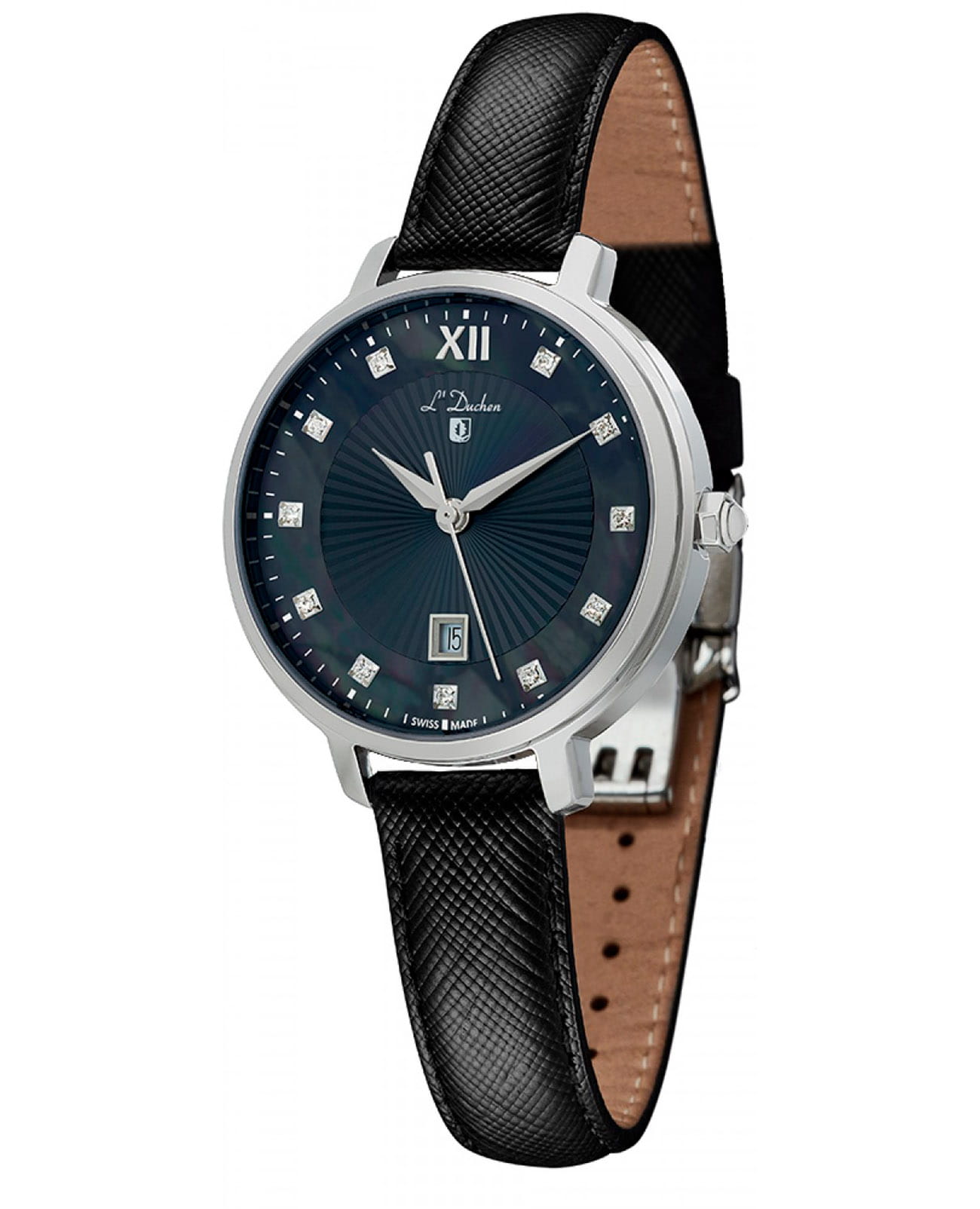Женские кварцевые часы L'Duchen из коллекции Satellite — это изысканный аксессуар, привлекающий внимание своим уникальным дизайном. Корпус диаметром 32 мм выполнен из нержавеющей стали 316L, а циферблат защищён сапфировым стекломСапфировое стеклоПрочный и надёжный материал из кристалла сапфира синтетического происхождения, характеризующийся особой твёрдостью и устойчивостью к царапинам и повреждениям.. Циферблат чёрного цвета украшен эффектным лучеобразным гильоше, исходящим из центра, и дополнен кольцом из натурального перламутра. Метки часов представлены сверкающими фианитами, закреплёнными в стальных кастах, что создаёт изысканное сияние. Объёмные мечевидные стрелки обеспечивают отличную читаемость. Окошко даты расположено в положении 6 часов и выделено металлической рамкой. Часы оснащены ремешком из натуральной кожи с сафьяновым тиснением и раскладной застёжкойРаскладная застёжкаТакой тип застёжки используется только на браслетах из металла. Она никогда не раскрывается полностью, происходит разделение на 2 и более частей. Раскладывающая застёжка снизит вероятность потери часов к минимуму. с клипсой, украшенной логотипом бренда — дубовым листом, символом мудрости и долголетия. Водонепроницаемость 50 м позволяет использовать часы в повседневных условиях.