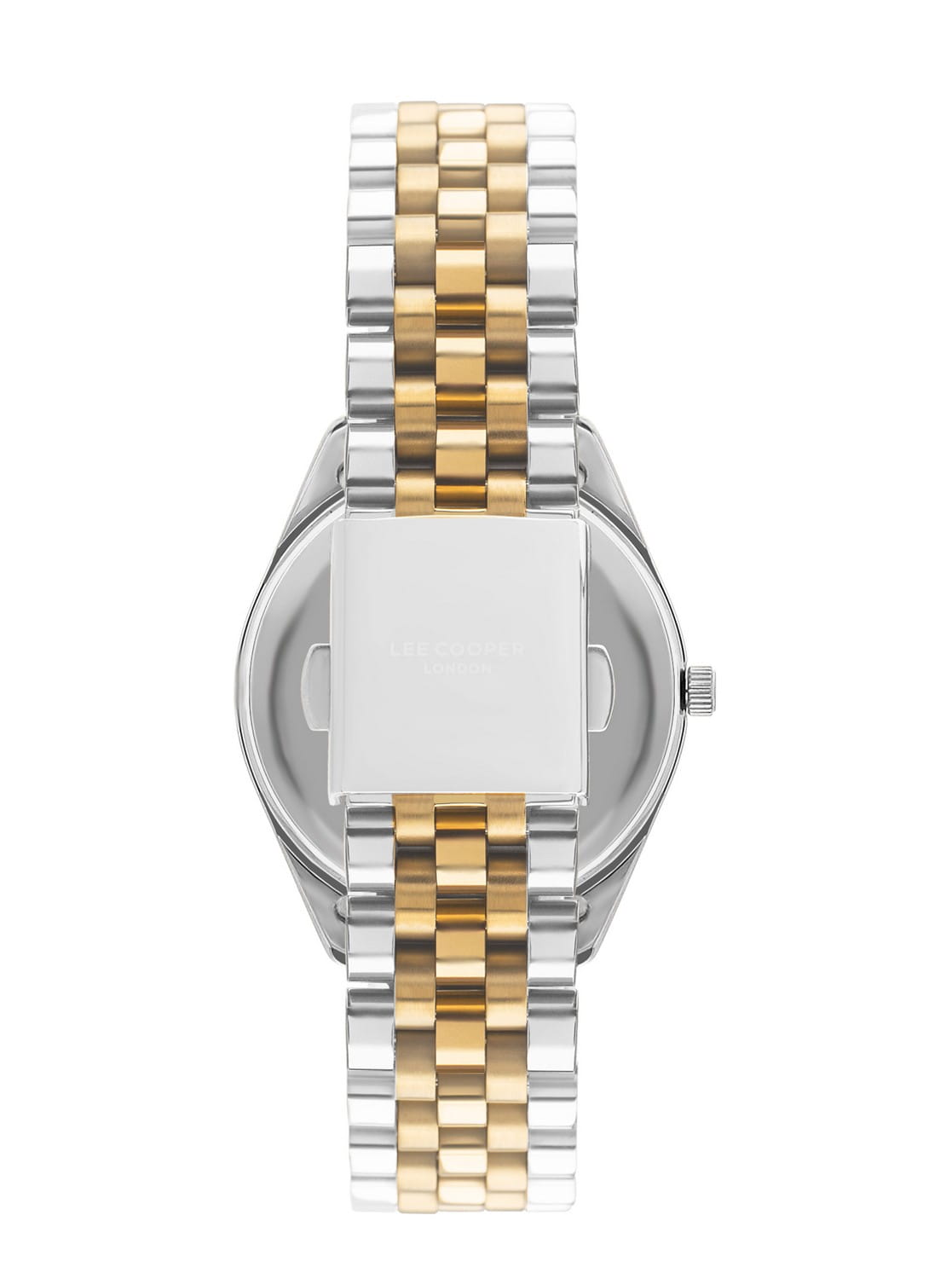 Женские часы Lee Cooper LC07831.220 выполнены в классическом стиле и сочетают строгий дизайн с надёжным механизмом. Модель оснащена кварцевым механизмом, обеспечивающим точность хода и минимальное обслуживание. Корпус круглой формы имеет размер 36 мм, изготовлен из суперметалла с изысканным неподвижным безелемБезельВнешний ободок, закрепляющий стекло. В спортивных часах так называется поворотное кольцо с делениями на циферблате, выполняет роль таймера – замеряет отрезки времени на шкале. Неподвижный безель – элемент декора. Однонаправленно вращающийся безель на дайверских часах позволяет фиксировать моменты погружения и выныривания на поверхность. с вставками из циркона, гарантирует комфорт при ношении. Циферблат дополнен изящными вставками из циркона для чёткого отсчёта времени. Защиту циферблата обеспечивает минеральное стеклоМинеральное стеклоМинеральное стекло представляет собой искусственно выращенный минерал кварца. Такое стекло отличается особой устойчивостью к повреждениям и царапинам. Уступает по некоторым качествам сапфировому стеклу., устойчивое к мелким механическим повреждениям. Стрелки с люминесцентным покрытиемЛюминесцентное покрытиеПозволяет считывать показания времени в темноте. Производители наносят на стрелки, часовые индексы, безель или поверхность циферблата светонакопительный состав, дающий холодное свечение.. Стальной браслет с частичным IP-покрытиемIP-покрытиеМетод ионного напыления. Демонстрирует повышенную устойчивость к истиранию, окислению и химическим веществам. Под воздействием высокого давления и температуры около 1500°C молекулы металла надёжно соединяются с частицами корпуса часов. на раскладной застёжкеРаскладная застёжкаТакой тип застёжки используется только на браслетах из металла. Она никогда не раскрывается полностью, происходит разделение на 2 и более частей. Раскладывающая застёжка снизит вероятность потери часов к минимуму. гарантирует удобную посадку и надёжную фиксацию на запястье. Водозащита 30WR позволяет использовать часы в повседневных условиях без риска повреждения от случайных брызг воды. Это сочетание классического дизайна, прочности материалов и качества исполнения для уверенных в себе женщин.