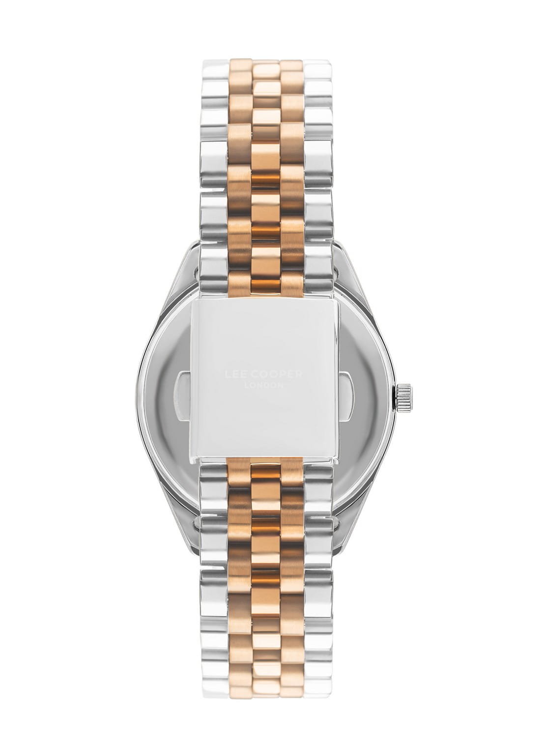 Женские часы Lee Cooper LC07831.520 выполнены в классическом стиле и сочетают строгий дизайн с надёжным механизмом. Модель оснащена кварцевым механизмом, обеспечивающим точность хода и минимальное обслуживание. Корпус круглой формы имеет размер 36 мм, изготовлен из суперметалла с изысканным неподвижным безелемБезельВнешний ободок, закрепляющий стекло. В спортивных часах так называется поворотное кольцо с делениями на циферблате, выполняет роль таймера – замеряет отрезки времени на шкале. Неподвижный безель – элемент декора. Однонаправленно вращающийся безель на дайверских часах позволяет фиксировать моменты погружения и выныривания на поверхность. с вставками из циркона, гарантирует комфорт при ношении. Циферблат дополнен изящными вставками из циркона для чёткого отсчёта времени. Защиту циферблата обеспечивает минеральное стеклоМинеральное стеклоМинеральное стекло представляет собой искусственно выращенный минерал кварца. Такое стекло отличается особой устойчивостью к повреждениям и царапинам. Уступает по некоторым качествам сапфировому стеклу., устойчивое к мелким механическим повреждениям. Стрелки с люминесцентным покрытиемЛюминесцентное покрытиеПозволяет считывать показания времени в темноте. Производители наносят на стрелки, часовые индексы, безель или поверхность циферблата светонакопительный состав, дающий холодное свечение.. Стальной браслет с частичным IP-покрытиемIP-покрытиеМетод ионного напыления. Демонстрирует повышенную устойчивость к истиранию, окислению и химическим веществам. Под воздействием высокого давления и температуры около 1500°C молекулы металла надёжно соединяются с частицами корпуса часов. на раскладной застёжкеРаскладная застёжкаТакой тип застёжки используется только на браслетах из металла. Она никогда не раскрывается полностью, происходит разделение на 2 и более частей. Раскладывающая застёжка снизит вероятность потери часов к минимуму. гарантирует удобную посадку и надёжную фиксацию на запястье. Водозащита 30WR позволяет использовать часы в повседневных условиях без риска повреждения от случайных брызг воды. Это сочетание классического дизайна, прочности материалов и качества исполнения для уверенных в себе женщин.