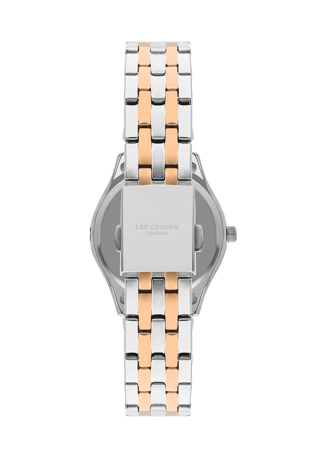 Женские часы Lee Cooper LC07832.520 выполнены в классическом стиле и сочетают строгий дизайн с надёжным механизмом. Модель оснащена кварцевым механизмом, обеспечивающим точность хода и минимальное обслуживание. Корпус круглой формы имеет размер 34 мм, изготовлен из суперметалла с изысканным неподвижным безелемБезельВнешний ободок, закрепляющий стекло. В спортивных часах так называется поворотное кольцо с делениями на циферблате, выполняет роль таймера – замеряет отрезки времени на шкале. Неподвижный безель – элемент декора. Однонаправленно вращающийся безель на дайверских часах позволяет фиксировать моменты погружения и выныривания на поверхность. с IP-покрытиемIP-покрытиеМетод ионного напыления. Демонстрирует повышенную устойчивость к истиранию, окислению и химическим веществам. Под воздействием высокого давления и температуры около 1500°C молекулы металла надёжно соединяются с частицами корпуса часов., гарантирует комфорт при ношении. Циферблат дополнен изящными вставками из циркона для чёткого отсчёта времени. Защиту циферблата обеспечивает минеральное стеклоМинеральное стеклоМинеральное стекло представляет собой искусственно выращенный минерал кварца. Такое стекло отличается особой устойчивостью к повреждениям и царапинам. Уступает по некоторым качествам сапфировому стеклу., устойчивое к мелким механическим повреждениям. Стрелки с люминесцентным покрытиемЛюминесцентное покрытиеПозволяет считывать показания времени в темноте. Производители наносят на стрелки, часовые индексы, безель или поверхность циферблата светонакопительный состав, дающий холодное свечение.. Стальной браслет с частичным IP-покрытиемIP-покрытиеМетод ионного напыления. Демонстрирует повышенную устойчивость к истиранию, окислению и химическим веществам. Под воздействием высокого давления и температуры около 1500°C молекулы металла надёжно соединяются с частицами корпуса часов. на раскладной застёжкеРаскладная застёжкаТакой тип застёжки используется только на браслетах из металла. Она никогда не раскрывается полностью, происходит разделение на 2 и более частей. Раскладывающая застёжка снизит вероятность потери часов к минимуму. гарантирует удобную посадку и надёжную фиксацию на запястье. Водозащита 30WR позволяет использовать часы в повседневных условиях без риска повреждения от случайных брызг воды. Это сочетание классического дизайна, прочности материалов и качества исполнения для уверенных в себе женщин.