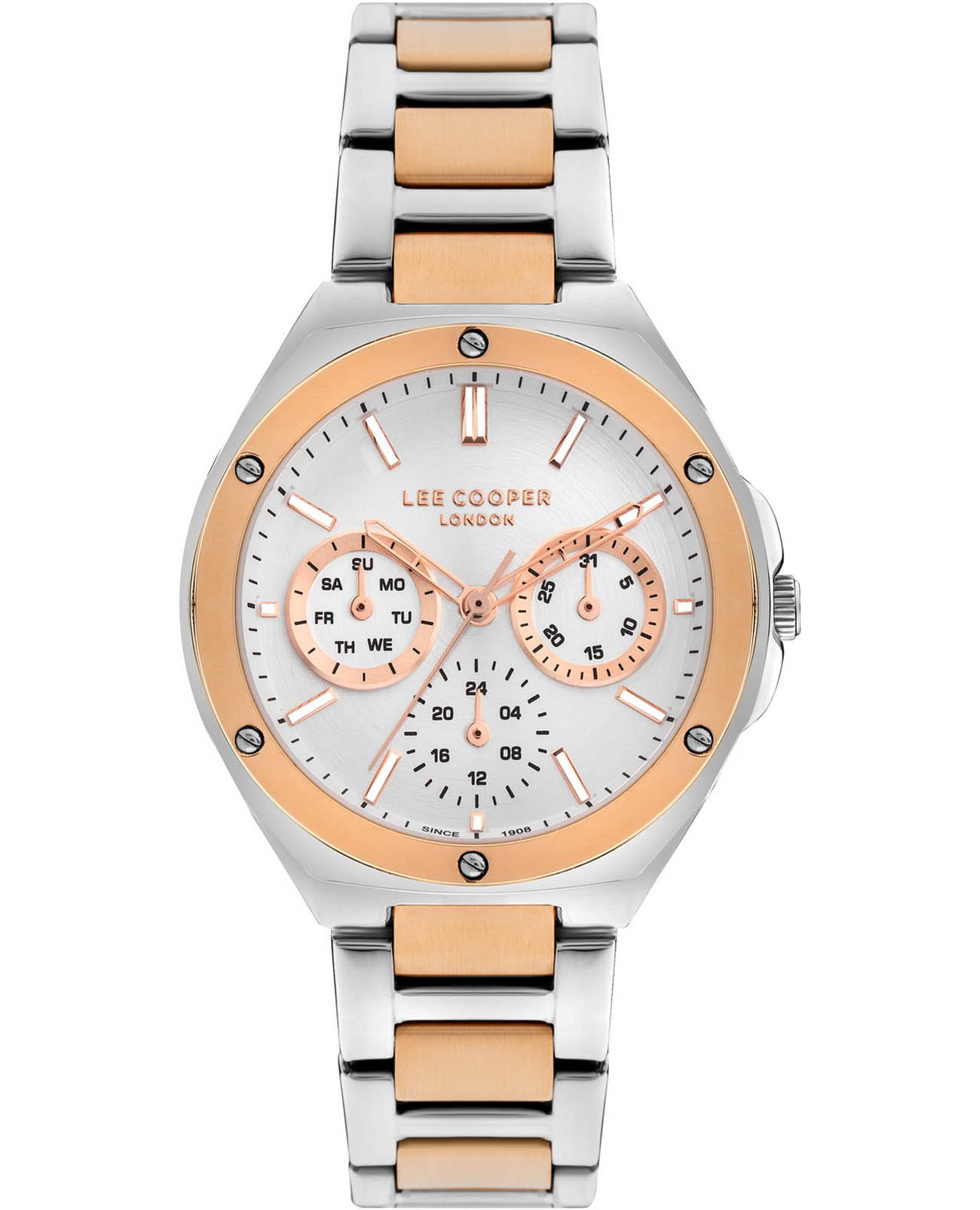 Женские наручные часы Lee Cooper LC07844.530 оснащены точным кварцевым механизмом, обеспечивающим высокую надежность и точность хода. Корпус часов изготовлен из суперметалла с неподвижным безелемБезельВнешний ободок, закрепляющий стекло. В спортивных часах так называется поворотное кольцо с делениями на циферблате, выполняет роль таймера – замеряет отрезки времени на шкале. Неподвижный безель – элемент декора. Однонаправленно вращающийся безель на дайверских часах позволяет фиксировать моменты погружения и выныривания на поверхность. с IP-покрытиемIP-покрытиеМетод ионного напыления. Демонстрирует повышенную устойчивость к истиранию, окислению и химическим веществам. Под воздействием высокого давления и температуры около 1500°C молекулы металла надёжно соединяются с частицами корпуса часов., что гарантирует долговечность и устойчивость к повреждениям. Три субдисплея отображают дату, день недели и 24-часовой формат времени, что добавляет функциональности и практичности. Для защиты циферблата используется минеральное стеклоМинеральное стеклоМинеральное стекло представляет собой искусственно выращенный минерал кварца. Такое стекло отличается особой устойчивостью к повреждениям и царапинам. Уступает по некоторым качествам сапфировому стеклу., устойчивое к царапинам и механическим повреждениям. Интегрированный браслет изготовлен из нержавеющей стали с IP-покрытиемIP-покрытиеМетод ионного напыления. Демонстрирует повышенную устойчивость к истиранию, окислению и химическим веществам. Под воздействием высокого давления и температуры около 1500°C молекулы металла надёжно соединяются с частицами корпуса часов., которая славится своей долговечностью и возможностью полировки. Метки покрыты люминесцентным покрытиемЛюминесцентное покрытиеПозволяет считывать показания времени в темноте. Производители наносят на стрелки, часовые индексы, безель или поверхность циферблата светонакопительный состав, дающий холодное свечение., обеспечивающим отличную читаемость в темноте. Браслет гармонично дополняет дизайн часов и обеспечивает комфортное ношение в течение дня благодаря раскладной застёжкеРаскладная застёжкаТакой тип застёжки используется только на браслетах из металла. Она никогда не раскрывается полностью, происходит разделение на 2 и более частей. Раскладывающая застёжка снизит вероятность потери часов к минимуму.. Эти часы сочетают в себе стиль и функциональность, что делает их универсальным аксессуаром, подходящим к любому образу. Модель станет прекрасным подарком. Часы обладают водонепроницаемостью до 50 метров (5 АТМ), что позволяет использовать их в повседневной жизни, включая контакт с водой при мытье рук или дожде.