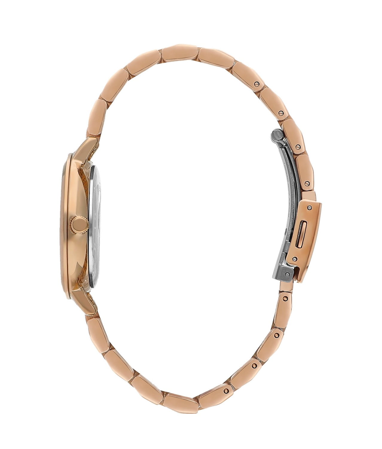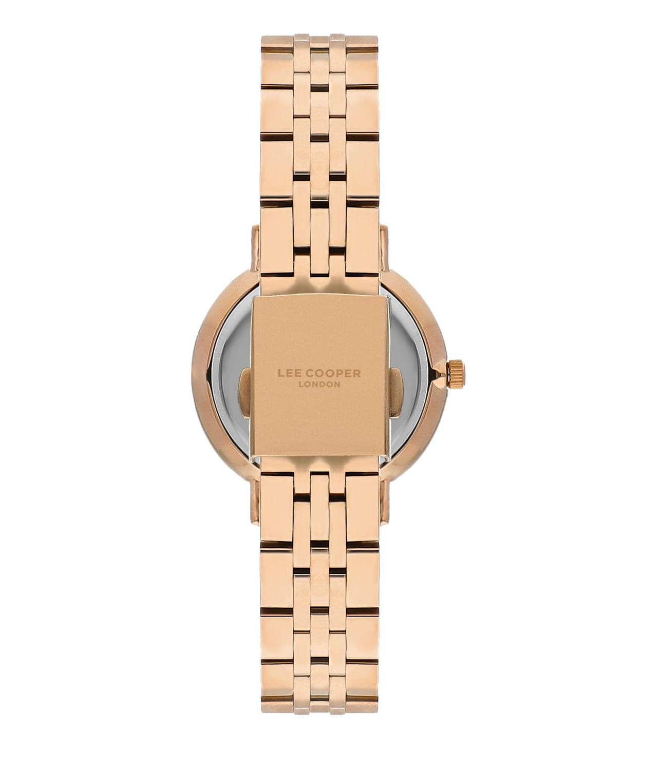 Женские часы Lee Cooper LC07857.420 — это стильное сочетание элегантности и современного дизайна. Изящный круглый корпус диаметром 34 мм выполнен из суперметалла с IP-покрытиемIP-покрытиеМетод ионного напыления. Демонстрирует повышенную устойчивость к истиранию, окислению и химическим веществам. Под воздействием высокого давления и температуры около 1500°C молекулы металла надёжно соединяются с частицами корпуса часов. золотого цвета, что придает модели особый блеск. Розовый циферблат защищен минеральным стекломМинеральное стеклоМинеральное стекло представляет собой искусственно выращенный минерал кварца. Такое стекло отличается особой устойчивостью к повреждениям и царапинам. Уступает по некоторым качествам сапфировому стеклу., обеспечивающим устойчивость к царапинам. Метки в виде штрихов. Часы оснащены надежным кварцевым механизмом, а стальной браслет с IP-покрытиемIP-покрытиеМетод ионного напыления. Демонстрирует повышенную устойчивость к истиранию, окислению и химическим веществам. Под воздействием высокого давления и температуры около 1500°C молекулы металла надёжно соединяются с частицами корпуса часов. золотого цвета на раскладной застёжкеРаскладная застёжкаТакой тип застёжки используется только на браслетах из металла. Она никогда не раскрывается полностью, происходит разделение на 2 и более частей. Раскладывающая застёжка снизит вероятность потери часов к минимуму. гарантирует комфортную посадку на запястье. Водозащита 30 метров защищает модель от случайных брызг и дождя. В комплекте к часам идет дополнительный браслет в цвет часов. Lee Cooper  — отличный выбор для тех, кто ценит утонченность и качество.
