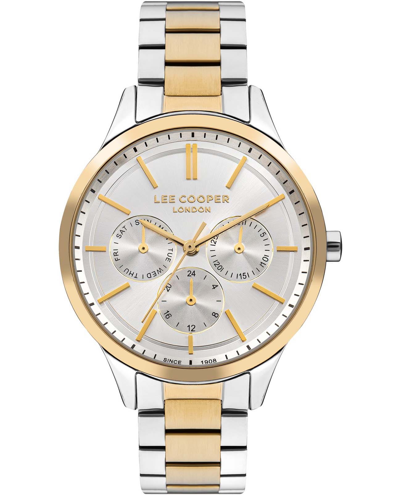 Женские часы Lee Cooper LC07865.230 — это стильное сочетание элегантности и современного дизайна. Круглый корпус диаметром 38 мм выполнен из суперметалла с безелемБезельВнешний ободок, закрепляющий стекло. В спортивных часах так называется поворотное кольцо с делениями на циферблате, выполняет роль таймера – замеряет отрезки времени на шкале. Неподвижный безель – элемент декора. Однонаправленно вращающийся безель на дайверских часах позволяет фиксировать моменты погружения и выныривания на поверхность. с IP-покрытиемIP-покрытиеМетод ионного напыления. Демонстрирует повышенную устойчивость к истиранию, окислению и химическим веществам. Под воздействием высокого давления и температуры около 1500°C молекулы металла надёжно соединяются с частицами корпуса часов. золотого цвета, придающий модели особый блеск. Серебристый циферблат защищен минеральным стекломМинеральное стеклоМинеральное стекло представляет собой искусственно выращенный минерал кварца. Такое стекло отличается особой устойчивостью к повреждениям и царапинам. Уступает по некоторым качествам сапфировому стеклу., обеспечивающим устойчивость к царапинам. Часы оснащены надежным кварцевым механизмом, а стальной браслет с частичным IP-покрытиемIP-покрытиеМетод ионного напыления. Демонстрирует повышенную устойчивость к истиранию, окислению и химическим веществам. Под воздействием высокого давления и температуры около 1500°C молекулы металла надёжно соединяются с частицами корпуса часов. на раскладной застёжкеРаскладная застёжкаТакой тип застёжки используется только на браслетах из металла. Она никогда не раскрывается полностью, происходит разделение на 2 и более частей. Раскладывающая застёжка снизит вероятность потери часов к минимуму. гарантирует комфортную посадку на запястье. Мультифункциональная модель с индикацией даты, дня недели, с дополнительным 24-х часовым индикатором. Водозащита 30 метров защищает модель от случайных брызг и дождя. Lee Cooper — отличный выбор для тех, кто ценит утонченность и качество.