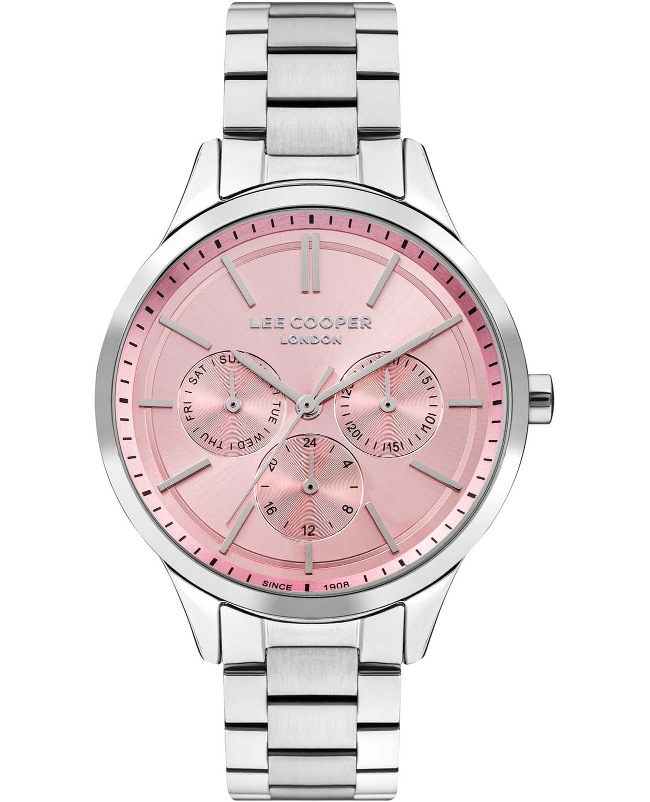 Женские часы Lee Cooper LC07865.380 — это стильное сочетание элегантности и современного дизайна. Круглый корпус диаметром 38 мм выполнен из суперметалла серебристого цвета, придающий модели особый блеск. Розовый циферблат защищен минеральным стекломМинеральное стеклоМинеральное стекло представляет собой искусственно выращенный минерал кварца. Такое стекло отличается особой устойчивостью к повреждениям и царапинам. Уступает по некоторым качествам сапфировому стеклу., обеспечивающим устойчивость к царапинам. Часы оснащены надежным кварцевым механизмом, а стальной браслет на раскладной застёжкеРаскладная застёжкаТакой тип застёжки используется только на браслетах из металла. Она никогда не раскрывается полностью, происходит разделение на 2 и более частей. Раскладывающая застёжка снизит вероятность потери часов к минимуму. гарантирует комфортную посадку на запястье. Мультифункциональная модель с индикацией даты, дня недели, с дополнительным 24-х часовым индикатором. Водозащита 30 метров защищает модель от случайных брызг и дождя. Lee Cooper  — отличный выбор для тех, кто ценит утонченность и качество.