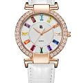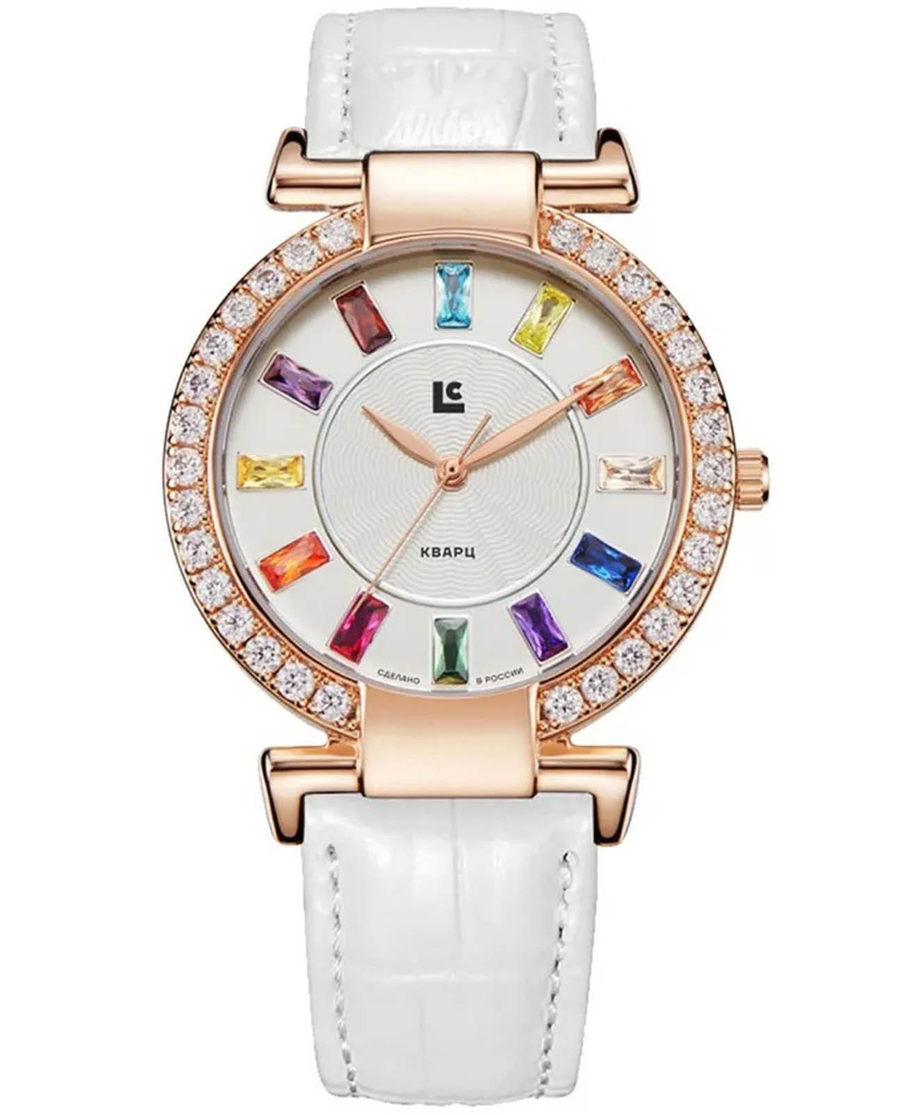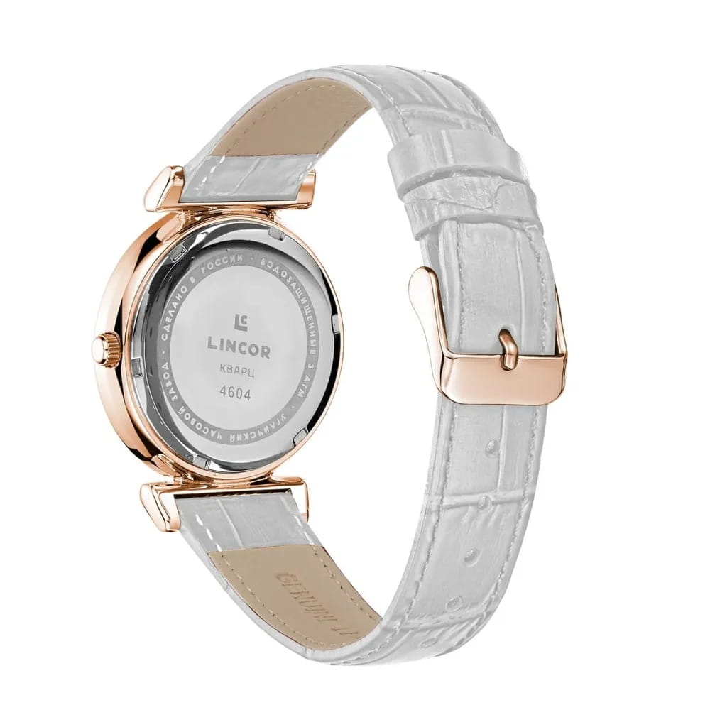 Женские кварцевые часы Lincor 4604L-5 с круглым корпусом из нержавеющей стали с PVD-покрытиемPVDУльтратонкое покрытие наносится в технике вакуумного напыления, сочетает в себе нитрид титана особой прочности со слоем золота или оксида хрома. Несёт в себе декоративную или защитную функцию. диаметром 36 мм. Циферблат оборудован метками и стрелками для лучшей индикации времени. Для защиты от царапин использовано минеральное стеклоМинеральное стеклоМинеральное стекло представляет собой искусственно выращенный минерал кварца. Такое стекло отличается особой устойчивостью к повреждениям и царапинам. Уступает по некоторым качествам сапфировому стеклу.. БезельБезельВнешний ободок, закрепляющий стекло. В спортивных часах так называется поворотное кольцо с делениями на циферблате, выполняет роль таймера – замеряет отрезки времени на шкале. Неподвижный безель – элемент декора. Однонаправленно вращающийся безель на дайверских часах позволяет фиксировать моменты погружения и выныривания на поверхность. декорирован кристаллами. Часы оснащены кожаным ремешком со стандартной застёжкой. Водозащита 30 м предназначена для защиты от брызг и дождя, купание не допускается.