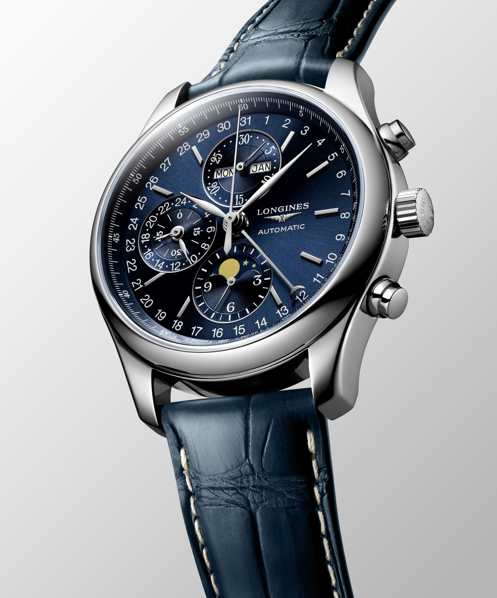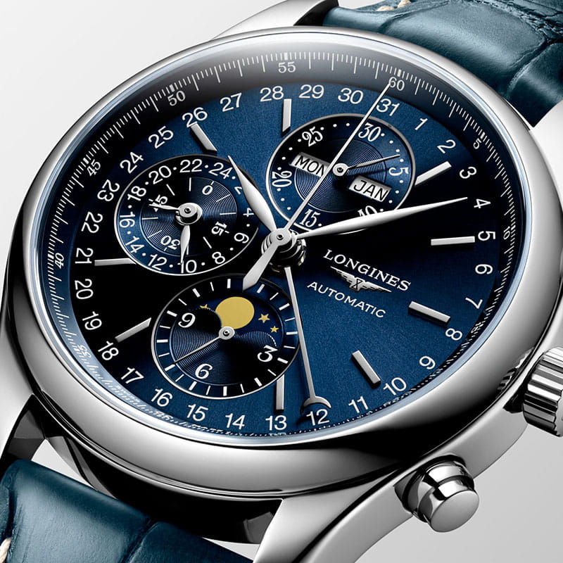 Синий циферблат дополнен счётчиками, смещёнными в левую сторону: лунный календарь, указатель дня недели и месяца, секундомер, индикация времени в 24-часовом формате. Дату указывает стрелка с серповидным наконечником. Швейцарский автоматический механизм L687 имеет резерв хода на 54 часа. Сапфировое стекло дополнено антибликовым покрытиемАнтибликовое покрытиеСлой оксида металла в 0,13-0,3 микрон, благодаря которому стекло часов не бликует и не отражает свет. Антибликовое покрытие уменьшает отражение света в 10 раз, обеспечивая отличную читаемость показателей циферблата..