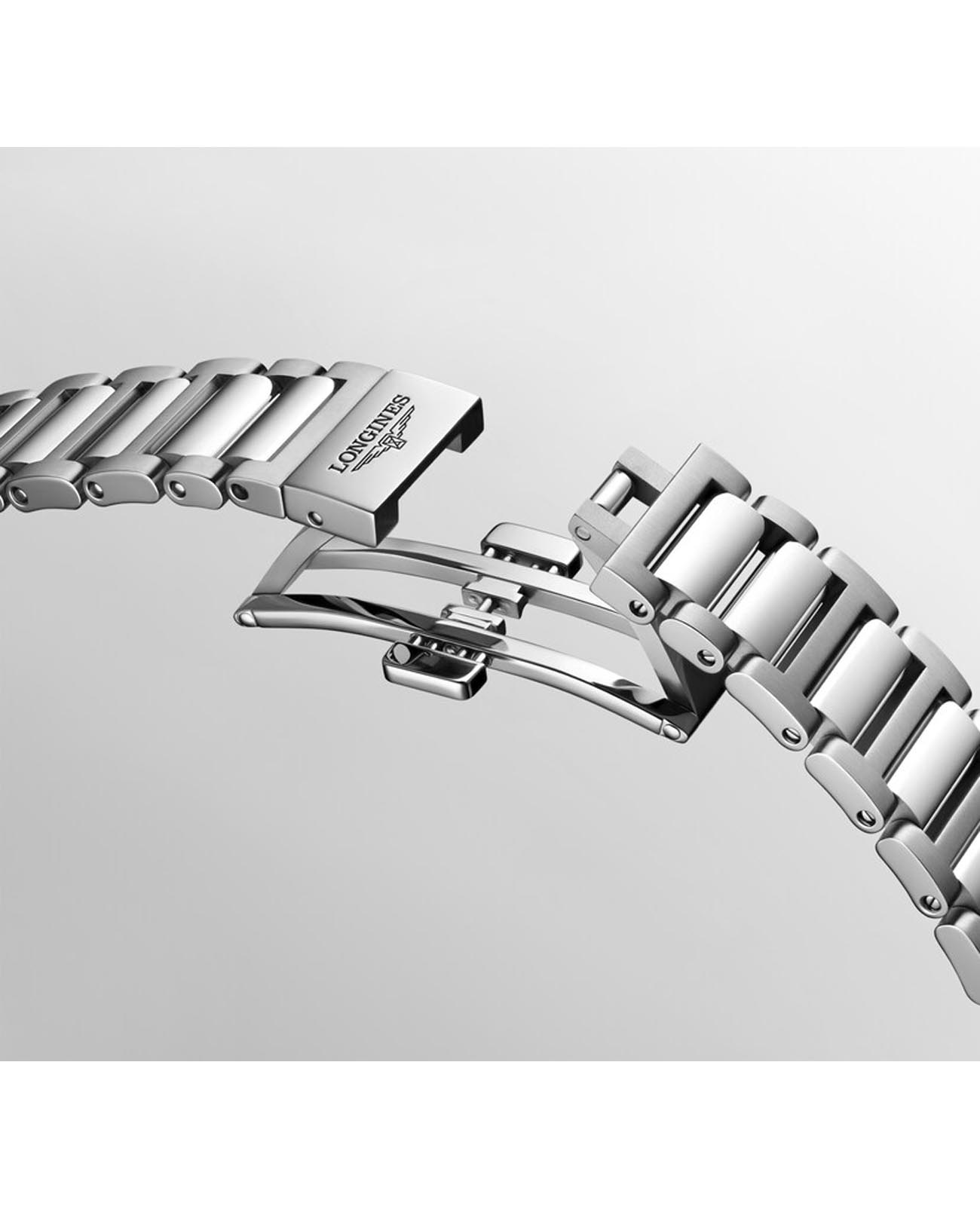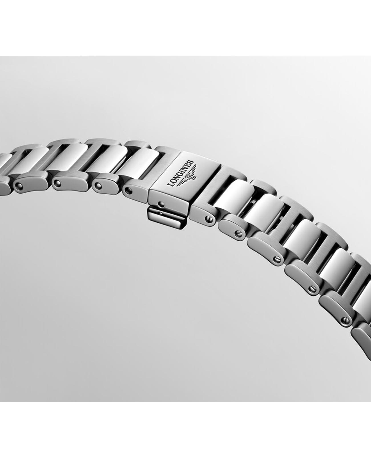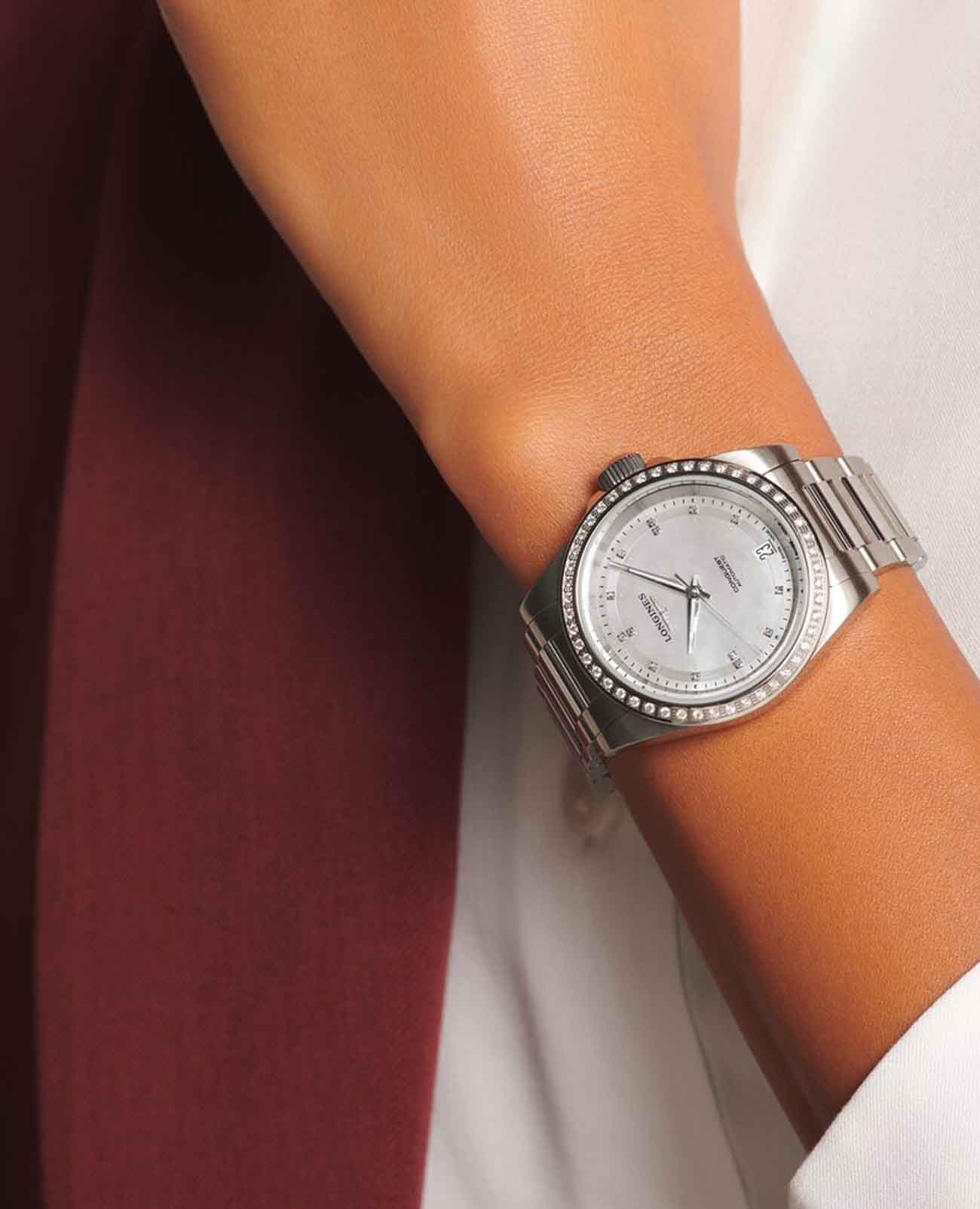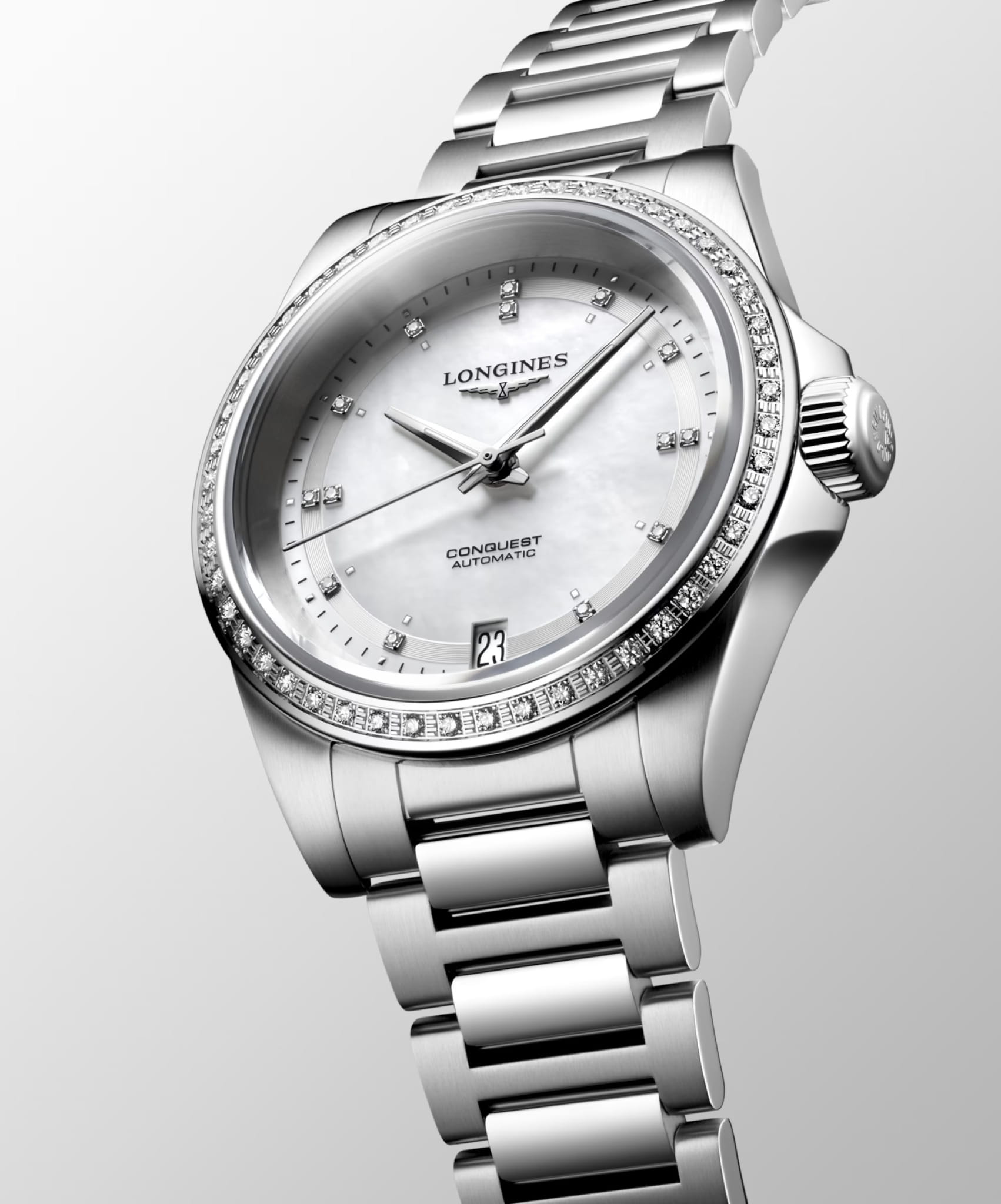 Женские швейцарские механические часы с автоподзаводом Longines Conquest L3.430.0.87.6. Сапфировое стеклоСапфировое стеклоПрочный и надёжный материал из кристалла сапфира синтетического происхождения, характеризующийся особой твёрдостью и устойчивостью к царапинам и повреждениям. устойчивое к появлению царапин, обладающее высокой прозрачностью. Корпус часов изготовлен из нержавеющей стали. Циферблат выполнен по технологии Sunray (солнечные лучи). Циферблат и безельБезельВнешний ободок, закрепляющий стекло. В спортивных часах так называется поворотное кольцо с делениями на циферблате, выполняет роль таймера – замеряет отрезки времени на шкале. Неподвижный безель – элемент декора. Однонаправленно вращающийся безель на дайверских часах позволяет фиксировать моменты погружения и выныривания на поверхность. украшены бриллиантами группы Top Wesselton VS-SI. Стрелки с люминесцентным покрытиемЛюминесцентное покрытиеПозволяет считывать показания времени в темноте. Производители наносят на стрелки, часовые индексы, безель или поверхность циферблата светонакопительный состав, дающий холодное свечение. Super-LumiNova. Окошко даты в положении 6 часов. Прозрачная задняя крышка. Класс водозащиты: 100 метров, позволит плавать, нырять и заниматься другими водными видами спорта. Стальной браслет на раскладной застёжкеРаскладная застёжкаТакой тип застёжки используется только на браслетах из металла. Она никогда не раскрывается полностью, происходит разделение на 2 и более частей. Раскладывающая застёжка снизит вероятность потери часов к минимуму..