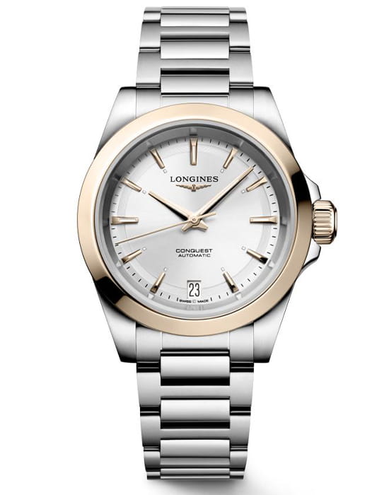 Женские швейцарские механические часы с автоподзаводом Longines Conquest L3.430.5.72.6. Сапфировое стеклоСапфировое стеклоПрочный и надёжный материал из кристалла сапфира синтетического происхождения, характеризующийся особой твёрдостью и устойчивостью к царапинам и повреждениям. устойчивое к появлению царапин, обладающее высокой прозрачностью. Корпус часов изготовлен из нержавеющей стали. Циферблат выполнен по технологии Sunray (солнечные лучи). Стрелки с люминесцентным покрытиемЛюминесцентное покрытиеПозволяет считывать показания времени в темноте. Производители наносят на стрелки, часовые индексы, безель или поверхность циферблата светонакопительный состав, дающий холодное свечение.. Окошко даты в положении 6 часов. Прозрачная задняя крышка. Класс водозащиты: 100 метров, позволит плавать, нырять и заниматься другими водными видами спорта. Стальной браслет на застёжке-бабочке с кнопкамиЗастёжка "бабочка"Такой вид застёжки дополняется предохранителями, помогающими избежать случайного раскрытия браслета. Обладают изящным исполнением. . БезельБезельВнешний ободок, закрепляющий стекло. В спортивных часах так называется поворотное кольцо с делениями на циферблате, выполняет роль таймера – замеряет отрезки времени на шкале. Неподвижный безель – элемент декора. Однонаправленно вращающийся безель на дайверских часах позволяет фиксировать моменты погружения и выныривания на поверхность. из стали с 18-каратным золотом18-каратное золотоОбозначение по каратной системе пробирования, оно показывает, сколько драгоценного металла содержится в изделии. 18 карат - в составе 75% чистого золота, соответствует 750 пробе.