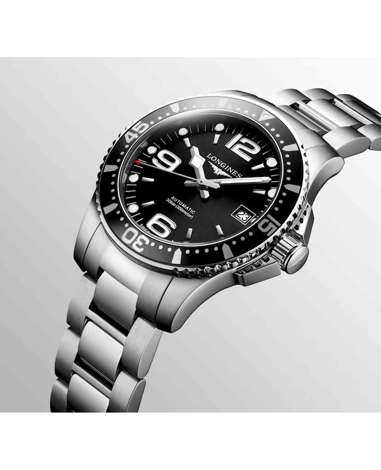 Мужские механические швейцарские часы с автоподзаводом Longines HydroConquest L3.781.3.96.7. Сапфировое стеклоСапфировое стеклоПрочный и надёжный материал из кристалла сапфира синтетического происхождения, характеризующийся особой твёрдостью и устойчивостью к царапинам и повреждениям. с антибликовым покрытием, устойчивое к мелким механическим повреждениям. Корпус часов изготовлен из нержавеющей стали. Вращающийся стальной безельБезельВнешний ободок, закрепляющий стекло. В спортивных часах так называется поворотное кольцо с делениями на циферблате, выполняет роль таймера – замеряет отрезки времени на шкале. Неподвижный безель – элемент декора. Однонаправленно вращающийся безель на дайверских часах позволяет фиксировать моменты погружения и выныривания на поверхность. с люминесцентным покрытиемЛюминесцентное покрытиеПозволяет считывать показания времени в темноте. Производители наносят на стрелки, часовые индексы, безель или поверхность циферблата светонакопительный состав, дающий холодное свечение. Superluminova из нержавеющей стали и керамики, защищенный от царапин, никогда не изнашивается и не выцветает. Стрелки и метки с люминесцентным покрытиемЛюминесцентное покрытиеПозволяет считывать показания времени в темноте. Производители наносят на стрелки, часовые индексы, безель или поверхность циферблата светонакопительный состав, дающий холодное свечение.. Окошко даты находится в положении 3 часа. Класс водозащиты: 300 метров, позволит плавать, нырять и заниматься другими водными видами спорта. Стальной браслет на раскладной застёжкеРаскладная застёжкаТакой тип застёжки используется только на браслетах из металла. Она никогда не раскрывается полностью, происходит разделение на 2 и более частей. Раскладывающая застёжка снизит вероятность потери часов к минимуму. с удлинением для дайверов.