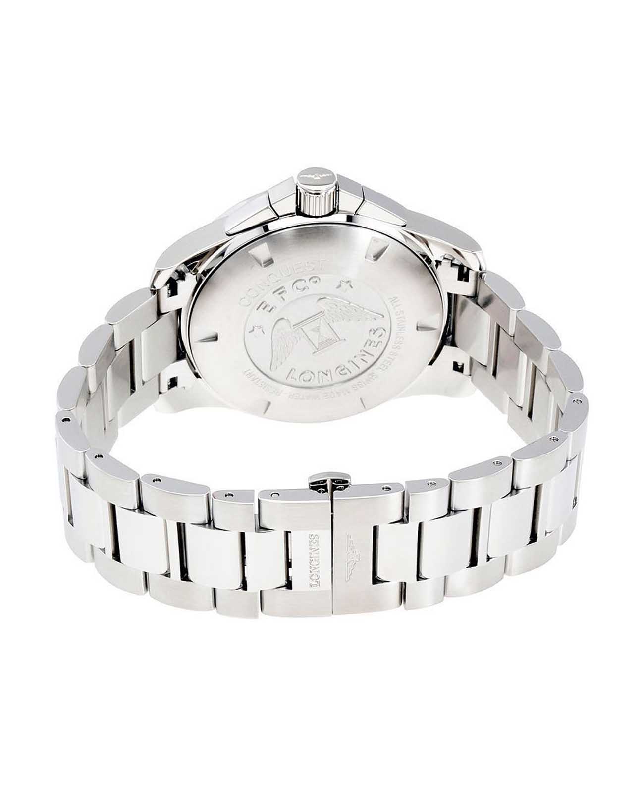 Мужские швейцарские механические часы- хронографХронографФункция позволяет измерять отрезки времени с особой точностью: часы, минуты, секунды. Верным признаком хронографа является наличие на циферблате 3 дополнительных окошек-счётчиков. для дайвинга Longines HydroConquest L3.800.4.56.6. Сапфировое стеклоСапфировое стеклоПрочный и надёжный материал из кристалла сапфира синтетического происхождения, характеризующийся особой твёрдостью и устойчивостью к царапинам и повреждениям. с многослойным антибликовым покрытием с обеих сторон, устойчивое к появлению царапин, обладающее высокой прозрачностью. Корпус часов изготовлен из стали. Стрелки и метки с люминесцентным покрытиемЛюминесцентное покрытиеПозволяет считывать показания времени в темноте. Производители наносят на стрелки, часовые индексы, безель или поверхность циферблата светонакопительный состав, дающий холодное свечение.. На циферблате расположены три дополнительных индикатора и окошко даты. Окошко даты находится в положении 4 часа. Класс водозащиты: 300 метров, позволит плавать, нырять и заниматься другими водными видами спорта. Стальной браслет на раскладной застёжкеРаскладная застёжкаТакой тип застёжки используется только на браслетах из металла. Она никогда не раскрывается полностью, происходит разделение на 2 и более частей. Раскладывающая застёжка снизит вероятность потери часов к минимуму..