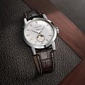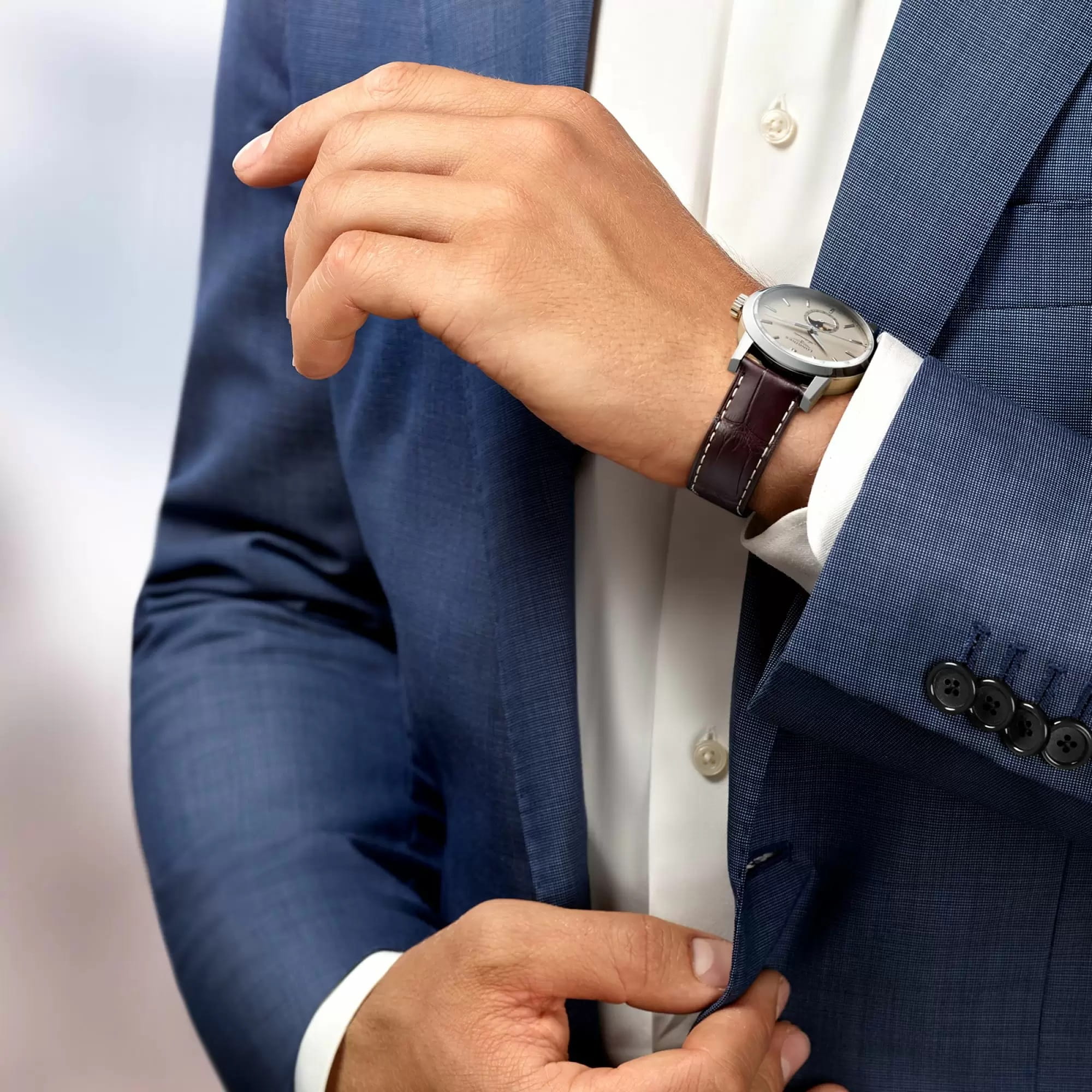 Внутри стального корпуса заключён швейцарский автоматический механизм L897. Калибр отличается 64-часовым запасом хода и обеспечивает высокую точность показателей времени. Ремешок из натуральной кожи аллигатора стильно смотрится на запястье. Сапфировое стекло дополнено многослойным антибликовым покрытиемАнтибликовое покрытиеСлой оксида металла в 0,13-0,3 микрон, благодаря которому стекло часов не бликует и не отражает свет. Антибликовое покрытие уменьшает отражение света в 10 раз, обеспечивая отличную читаемость показателей циферблата.. Особенности: люминесцентная подсветкаЛюминесцентное покрытиеПозволяет считывать показания времени в темноте. Производители наносят на стрелки, часовые индексы, безель или поверхность циферблата светонакопительный состав, дающий холодное свечение., годовой календарь.
