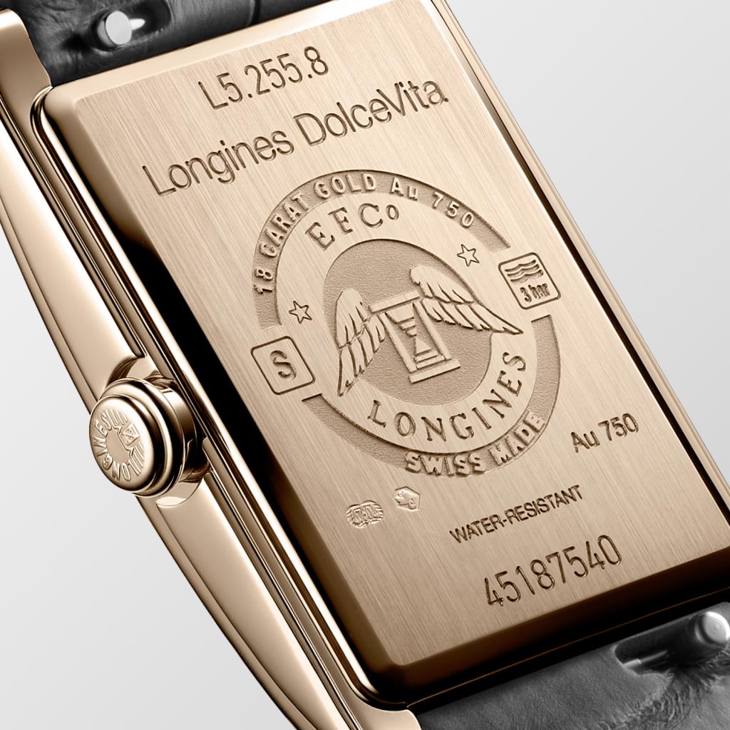 Женские швейцарские часы Longines DolceVita L5.255.8.75.2, кварцевый механизм с высокой точностью. Сапфировое стеклоСапфировое стеклоПрочный и надёжный материал из кристалла сапфира синтетического происхождения, характеризующийся особой твёрдостью и устойчивостью к царапинам и повреждениям. устойчивое к появлению царапин, обладающее высокой прозрачностью. Корпус часов изготовлен из 18-каратного золота18-каратное золотоОбозначение по каратной системе пробирования, оно показывает, сколько драгоценного металла содержится в изделии. 18 карат - в составе 75% чистого золота, соответствует 750 пробе.