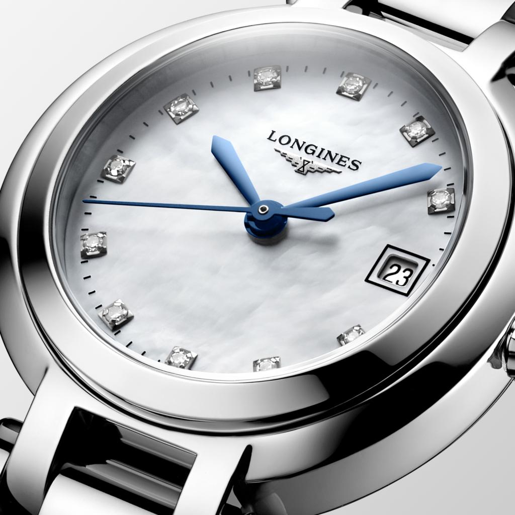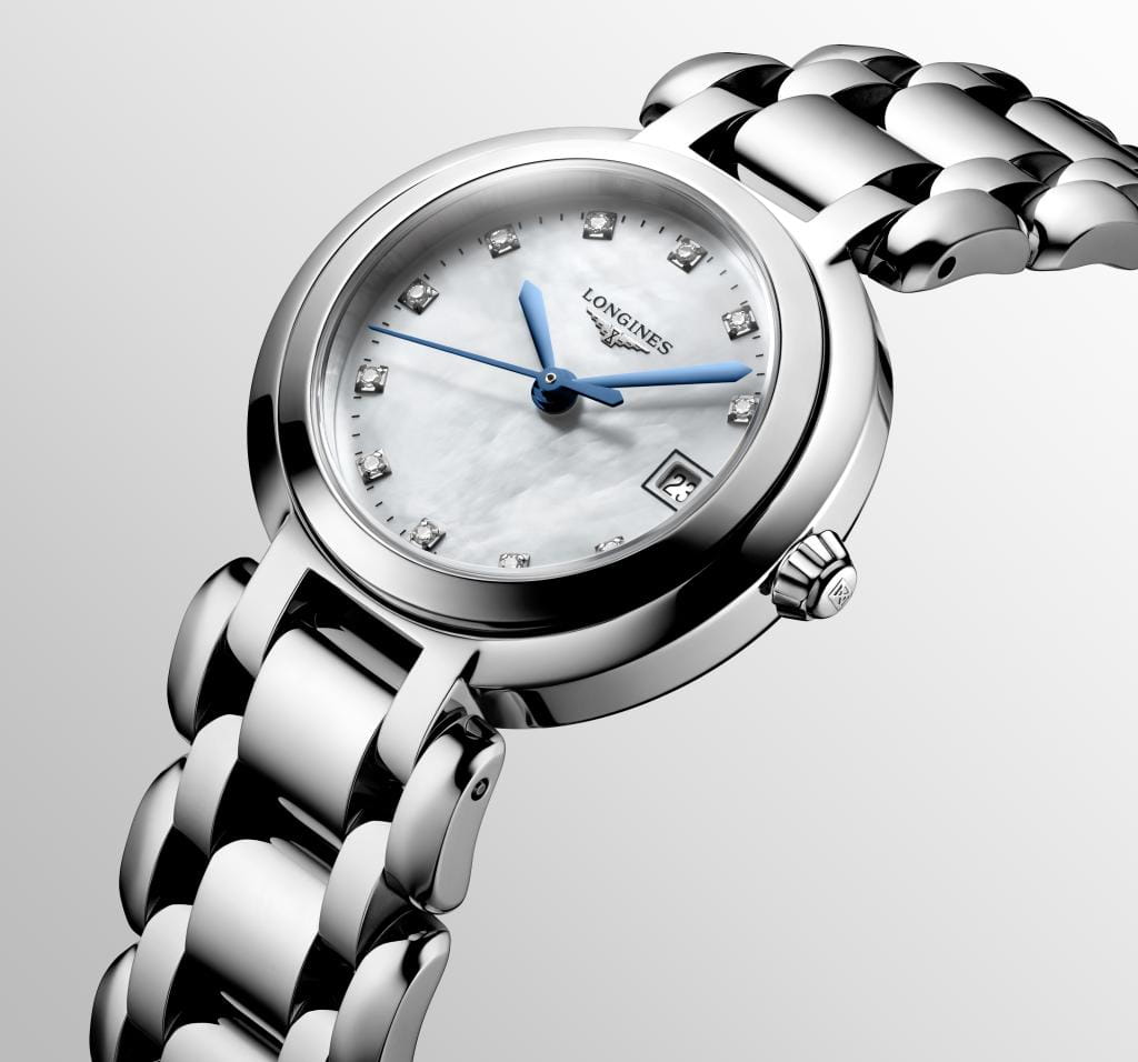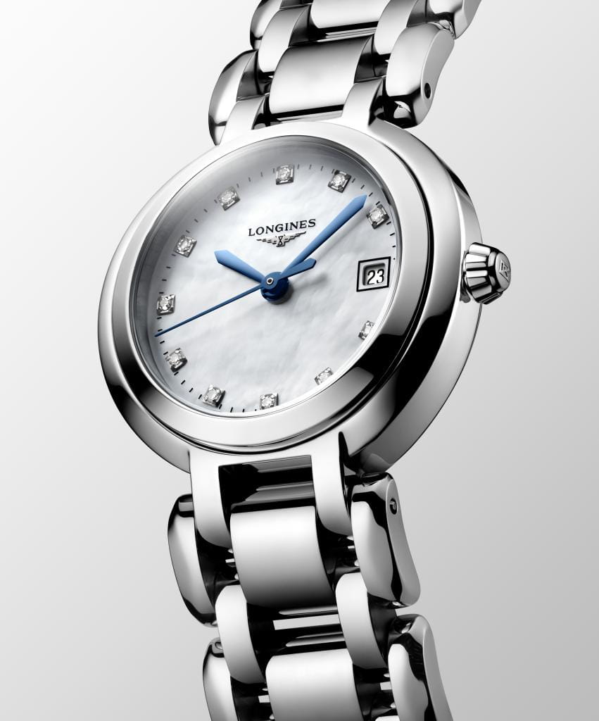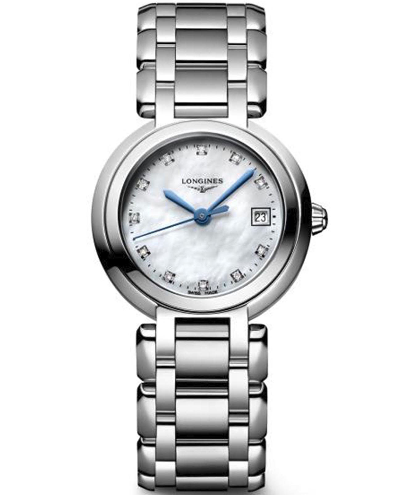 Женские швейцарские механические часы с автоподзаводом Longines PrimaLuna L8.120.4.87.6. Исключительно женственная коллекция. Округлые, нежные линии Longines Prima Luna - дань преклонения перед женственной Луной, символом переменчивости времени. Сапфировое стеклоСапфировое стеклоПрочный и надёжный материал из кристалла сапфира синтетического происхождения, характеризующийся особой твёрдостью и устойчивостью к царапинам и повреждениям. устойчивое к появлению царапин, обладающее высокой прозрачностью. Корпус часов изготовлен из нержавеющей стали. Изысканная чистота циферблата подчеркивает ее мягкий силуэт, обрамленный сиянием бриллиантов. Окошко даты в положении 3 часов. Класс водозащиты: 30 метров, позволит защитить корпус от случайных брызг или капель дождя. Стальной браслет на застёжке-бабочке с кнопкамиЗастёжка "бабочка"Такой вид застёжки дополняется предохранителями, помогающими избежать случайного раскрытия браслета. Обладают изящным исполнением. .