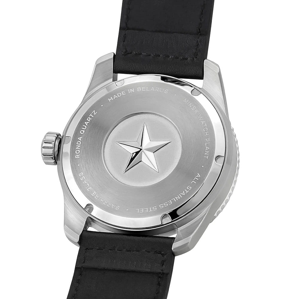 Мужские наручные часы Луч Commander 76760565 — это стильное сочетание элегантности и современного дизайна. Элегантный корпус диаметром 46.8 мм выполнен из нержавеющей стали, который придает модели особый изысканный вид. Циферблат защищен сапфировым стекломСапфировое стеклоПрочный и надёжный материал из кристалла сапфира синтетического происхождения, характеризующийся особой твёрдостью и устойчивостью к царапинам и повреждениям., обеспечивающим устойчивость к царапинам. Метки в виде штрихов и арабских цифр. Часы оснащены кварцевым механизмом, а кожаный ремень на стандартной застежке гарантирует комфортную посадку на запястье. Поворотный безельБезельВнешний ободок, закрепляющий стекло. В спортивных часах так называется поворотное кольцо с делениями на циферблате, выполняет роль таймера – замеряет отрезки времени на шкале. Неподвижный безель – элемент декора. Однонаправленно вращающийся безель на дайверских часах позволяет фиксировать моменты погружения и выныривания на поверхность. с PVD-покрытиемPVDУльтратонкое покрытие наносится в технике вакуумного напыления, сочетает в себе нитрид титана особой прочности со слоем золота или оксида хрома. Несёт в себе декоративную или защитную функцию. черного цвета. Стрелки и метки с люминесцентным покрытиемЛюминесцентное покрытиеПозволяет считывать показания времени в темноте. Производители наносят на стрелки, часовые индексы, безель или поверхность циферблата светонакопительный состав, дающий холодное свечение. позволяют легко считывать время даже в условиях недостаточного освещения. Водозащита 10 бар позволит защитить корпус от случайных брызг или капель дождя. Луч — отличный выбор для тех, кто ценит утонченность и качество.