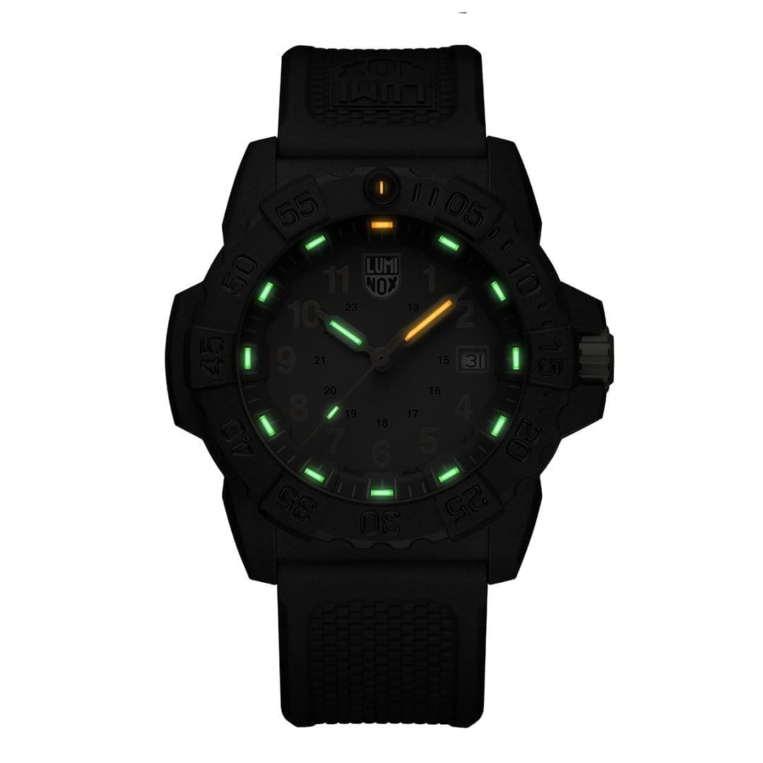 Часы Luminox XS.3508.GOLD — это надежные и стильные швейцарские часы с кварцевым механизмом, оснащенные калибром Ronda 515. Корпус выполнен из пластика, усиленного прессованным карбоном CARBONOX, что обеспечивает прочность и долговечность. Серый циферблат защищен минеральным стекломМинеральное стеклоМинеральное стекло представляет собой искусственно выращенный минерал кварца. Такое стекло отличается особой устойчивостью к повреждениям и царапинам. Уступает по некоторым качествам сапфировому стеклу. повышенной прочности, что делает его устойчивым к царапинам и ударам. Резиновый ремешок обеспечивает комфортное ношение и надежность фиксации на запястье. Эти часы обладают впечатляющим уровнем водозащиты до 200 метров, что делает их подходящими для водных видов спорта и активного отдыха. Светящаяся метка на безелеБезельВнешний ободок, закрепляющий стекло. В спортивных часах так называется поворотное кольцо с делениями на циферблате, выполняет роль таймера – замеряет отрезки времени на шкале. Неподвижный безель – элемент декора. Однонаправленно вращающийся безель на дайверских часах позволяет фиксировать моменты погружения и выныривания на поверхность., который вращается в одном направлении, добавляет функциональности и удобства, особенно в условиях низкой освещенности. Технология LLTLLTLLT — это автономный механизм подсветки, основанный на использовании микроскопических газонаполненных элементов. Специальные герметичные капсулы из боросиликатного стекла, интегрированные в циферблат, генерируют свечение без необходимости подключения к внешним источникам энергии. Для их работы не требуется ни дополнительный свет, ни механическое воздействие (например, нажатие кнопки). Свечение возникает благодаря химическому процессу: реакция между тритием, заключенным в капсулах, и люминофорным покрытием создает стабильное автономное освещение. Технология обеспечивает энергетическую независимость и долговечность подсветки.-подсветки обеспечивает отличную видимость в темноте на протяжении 25 лет, позволяя контролировать время даже при полном отсутствии света. Часы поддерживают отображение времени в 12- и 24-часовом формате, а наличие календаря с указанием числа добавляет практичности. Заводная головка снабжена защитой и двойной уплотнительной прокладкой для обеспечения герметичности, а задняя крышка крепится на винтах для дополнительной надежности.