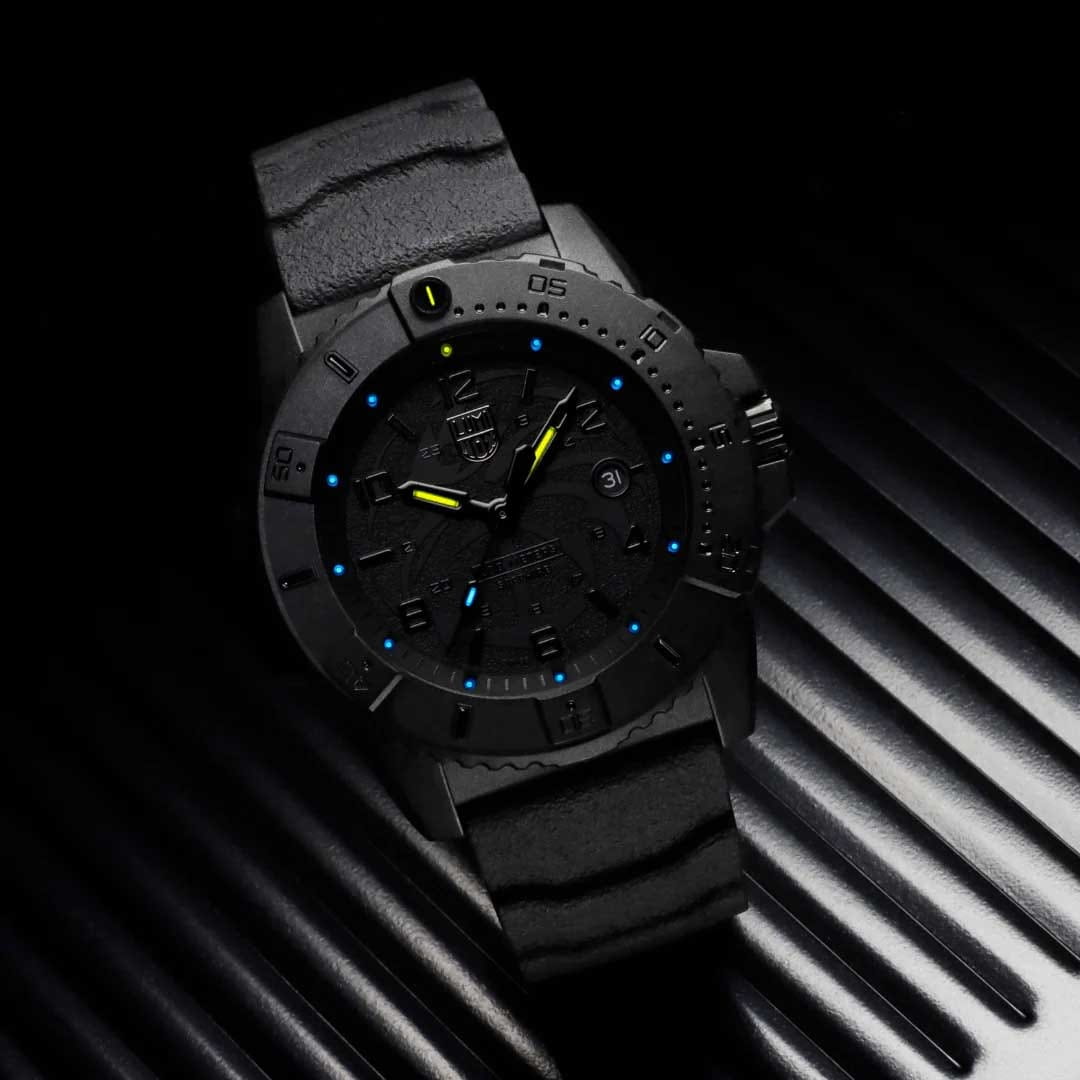 Швейцарские кварцевые часы Luminox XS.3601.BO.NSF идеально сочетают в себе современный стиль и надежность. Благодаря корпусу из пластика, усиленного прессованным карбономКарбонОт «carbon», «carbone» - углерод, углепластик - полимерный композиционный материал из переплетённых под определенным углом между собой нитей углеродного волокна, применяется для изготовления лёгких, но прочных деталей. В часах часто используют для украшения циферблатов и ремешков. Так же карбон используется в изготовлении корпусов. Такие корпуса обладают антикоррозионным свойством, не поддаются электромагнитному излучению, обладают повышенной прочностью и противоударностью., они отличаются прочностью и малым весом. Черный циферблат подчеркивает спортивный дизайн модели, а полиуретановый ремешок с классической застежкой обеспечивает комфорт при носке. Часы обладают водозащитой на глубине до 200 метров, что делает их идеальным выбором для любителей водных видов спорта. LLTLLTLLT — это автономный механизм подсветки, основанный на использовании микроскопических газонаполненных элементов. Специальные герметичные капсулы из боросиликатного стекла, интегрированные в циферблат, генерируют свечение без необходимости подключения к внешним источникам энергии. Для их работы не требуется ни дополнительный свет, ни механическое воздействие (например, нажатие кнопки). Свечение возникает благодаря химическому процессу: реакция между тритием, заключенным в капсулах, и люминофорным покрытием создает стабильное автономное освещение. Технология обеспечивает энергетическую независимость и долговечность подсветки.-подсветка гарантирует отличную видимость в темное время суток, а сапфировое стеклоСапфировое стеклоПрочный и надёжный материал из кристалла сапфира синтетического происхождения, характеризующийся особой твёрдостью и устойчивостью к царапинам и повреждениям. с антибликовым покрытиемАнтибликовое покрытиеСлой оксида металла в 0,13-0,3 микрон, благодаря которому стекло часов не бликует и не отражает свет. Антибликовое покрытие уменьшает отражение света в 10 раз, обеспечивая отличную читаемость показателей циферблата. защищает от царапин и обеспечивает четкость отображения. Модель оснащена функцией календаря с окошком даты, дополненным увеличительным стеклом для удобства использования. Часы поддерживают 12-ти и 24-х часовой формат времени, а вращающийся в одном направлении безельБезельВнешний ободок, закрепляющий стекло. В спортивных часах так называется поворотное кольцо с делениями на циферблате, выполняет роль таймера – замеряет отрезки времени на шкале. Неподвижный безель – элемент декора. Однонаправленно вращающийся безель на дайверских часах позволяет фиксировать моменты погружения и выныривания на поверхность. позволяет отслеживать время погружения или других активностей. Задняя крышка и заводная головка выполнены из стали, что добавляет дополнительную прочность конструкции. Заводная головка с защитой предотвращает случайное изменение времени. Благодаря диаметру в 45 мм и толщине 14 мм, эти часы обладают внушительным и привлекательным внешним видом.