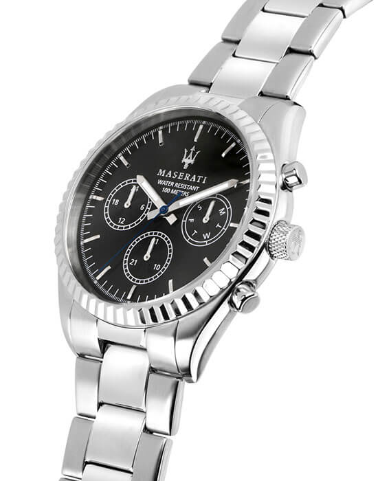 Мужские часы с хронографом Maserati COMPETIZIONE R8853100023, кварцевый механизм с высокой точностью. Класс водозащиты: 100 метров, позволит плавать, нырять и заниматься другими водными видами спорта. Корпус часов изготовлен из стали, серебристого цвета.