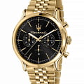 Мужские итальянские часы-хронографХронографФункция позволяет измерять отрезки времени с особой точностью: часы, минуты, секунды. Верным признаком хронографа является наличие на циферблате 3 дополнительных окошек-счётчиков. Maserati Epoca R8873618023, кварцевый механизм с высокой точностью. Минеральное стеклоМинеральное стеклоМинеральное стекло представляет собой искусственно выращенный минерал кварца. Такое стекло отличается особой устойчивостью к повреждениям и царапинам. Уступает по некоторым качествам сапфировому стеклу. устойчивое к появлению царапин и износу. Класс водозащиты: 100 метров, позволит плавать, нырять и заниматься другими водными видами спорта. Корпус и браслет часов изготовлен из стали с PVD-покрытиемPVDУльтратонкое покрытие наносится в технике вакуумного напыления, сочетает в себе нитрид титана особой прочности со слоем золота или оксида хрома. Несёт в себе декоративную или защитную функцию.. Люминесцентная подсветкаЛюминесцентное покрытиеПозволяет считывать показания времени в темноте. Производители наносят на стрелки, часовые индексы, безель или поверхность циферблата светонакопительный состав, дающий холодное свечение. стрелок.
