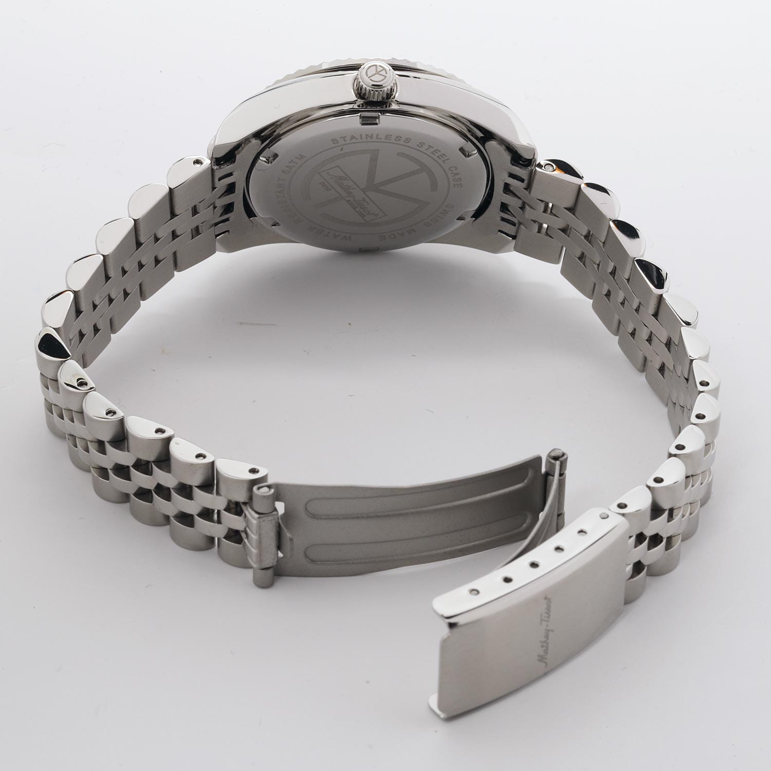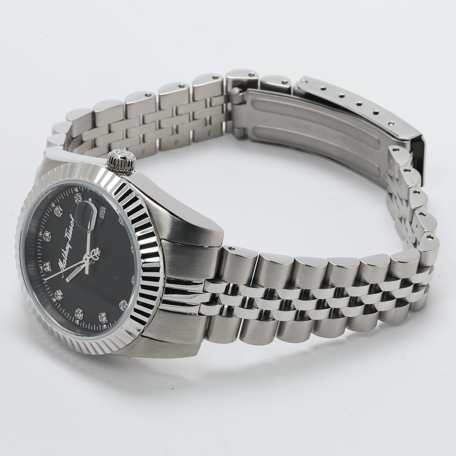 Женские кварцевые часы Mathey-Tissot Rolly D810AN — это стильное сочетание элегантности и современного дизайна. Изящный корпус выполнен из нержавеющей стали, диаметром 30 мм, что придаст образу женственности и романтизма. Изысканный циферблат с метками в виде точек придает модели особый блеск. Циферблат защищен минеральным стекломМинеральное стеклоМинеральное стекло представляет собой искусственно выращенный минерал кварца. Такое стекло отличается особой устойчивостью к повреждениям и царапинам. Уступает по некоторым качествам сапфировому стеклу., обеспечивающий устойчивость к царапинам. Стрелки с люминесцентным покрытиемЛюминесцентное покрытиеПозволяет считывать показания времени в темноте. Производители наносят на стрелки, часовые индексы, безель или поверхность циферблата светонакопительный состав, дающий холодное свечение.. Рифленый безельБезельВнешний ободок, закрепляющий стекло. В спортивных часах так называется поворотное кольцо с делениями на циферблате, выполняет роль таймера – замеряет отрезки времени на шкале. Неподвижный безель – элемент декора. Однонаправленно вращающийся безель на дайверских часах позволяет фиксировать моменты погружения и выныривания на поверхность. серебристого цвета. Циферблат украшен кристаллами. Окошко даты находится в положении 3 часа. Часы оснащены надежным кварцевым механизмом. Стальной браслет на раскладной застёжкеРаскладная застёжкаТакой тип застёжки используется только на браслетах из металла. Она никогда не раскрывается полностью, происходит разделение на 2 и более частей. Раскладывающая застёжка снизит вероятность потери часов к минимуму., гарантирует комфортное и безопасное ношение. Класс водозащиты: 50 метров позволит защитить корпус от случайных брызг или капель дождя. Mathey-Tissot — отличный выбор для тех, кто ценит утонченность и качество.