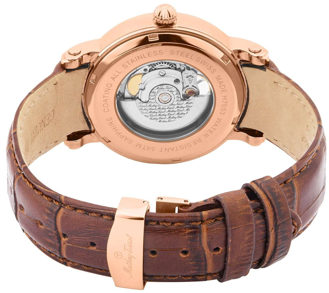 Мужские механические часы с автоподзаводом Mathey-Tissot Mathy H7053PI — это стильное сочетание элегантности и современного дизайна. Изящный корпус выполнен из нержавеющей стали с PVD-покрытиемPVDУльтратонкое покрытие наносится в технике вакуумного напыления, сочетает в себе нитрид титана особой прочности со слоем золота или оксида хрома. Несёт в себе декоративную или защитную функцию., диаметром 42 мм, что придаст образу элегантности и надежности. Циферблат с метками в виде штрихов и римской цифры придает модели особый блеск. Циферблат защищен минеральным стекломМинеральное стеклоМинеральное стекло представляет собой искусственно выращенный минерал кварца. Такое стекло отличается особой устойчивостью к повреждениям и царапинам. Уступает по некоторым качествам сапфировому стеклу. с сапфировым покрытием, обеспечивает устойчивость к царапинам. Стрелки с люминесцентным покрытиемЛюминесцентное покрытиеПозволяет считывать показания времени в темноте. Производители наносят на стрелки, часовые индексы, безель или поверхность циферблата светонакопительный состав, дающий холодное свечение.. Кожаный ремешок с раскладной застёжкойРаскладная застёжкаТакой тип застёжки используется только на браслетах из металла. Она никогда не раскрывается полностью, происходит разделение на 2 и более частей. Раскладывающая застёжка снизит вероятность потери часов к минимуму. гарантирует комфортное и безопасное ношение. Класс водозащиты: 50 метров позволит защитить корпус от случайных брызг или капель дождя. Mathey-Tissot — отличный выбор для тех, кто ценит утонченность и качество.