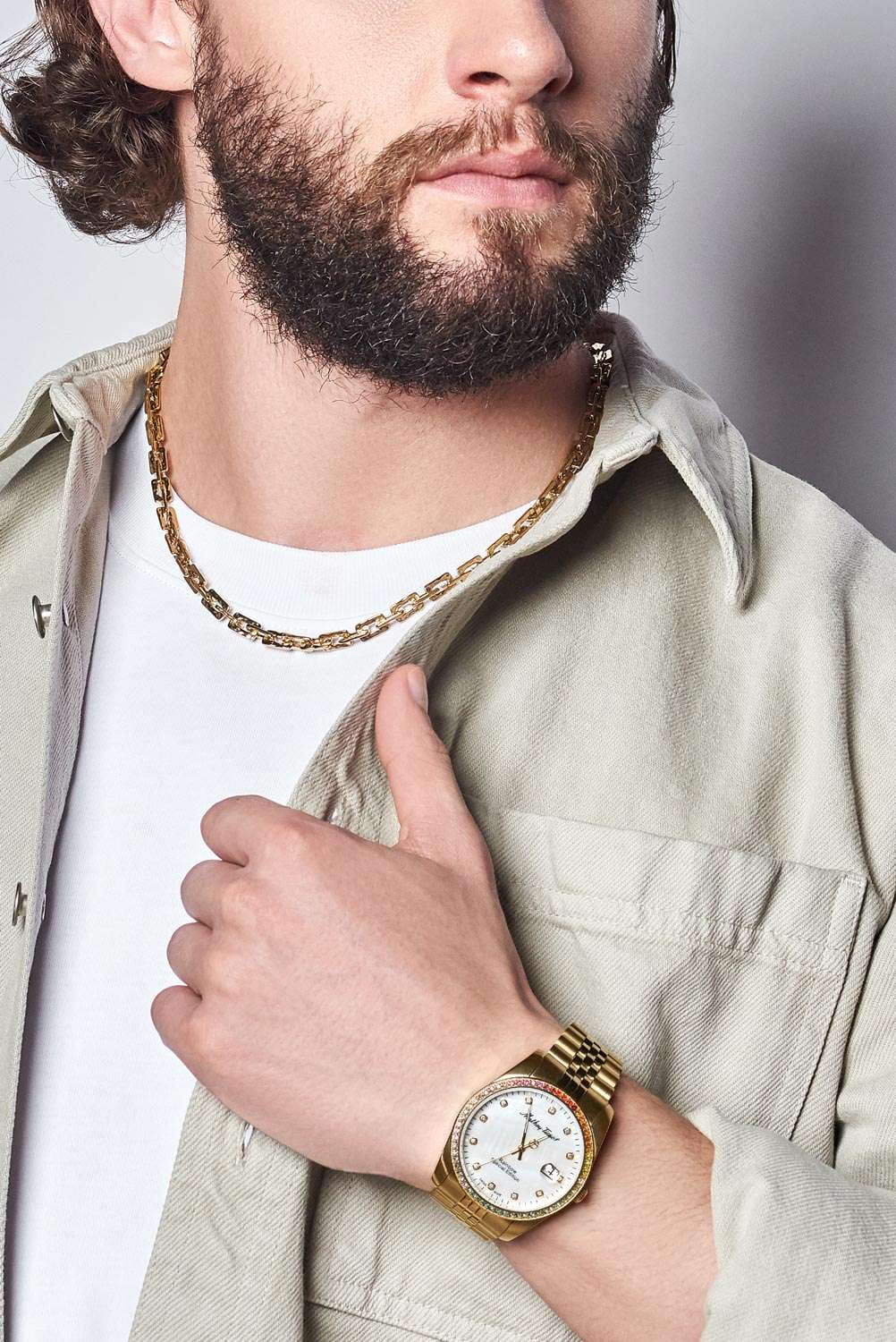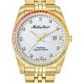 Мужские кварцевые часы Mathey-Tissot Mathy H809PQYI — это стильное сочетание элегантности и современного дизайна. Изящный корпус выполнен из нержавеющей стали с PVD-покрытиемPVDУльтратонкое покрытие наносится в технике вакуумного напыления, сочетает в себе нитрид титана особой прочности со слоем золота или оксида хрома. Несёт в себе декоративную или защитную функцию. золотистого цвета, диаметром 40 мм, что придаст образу элегантности и надежности. Изысканный циферблат с метками в виде точек придает модели особый блеск. Циферблат защищен минеральным стекломМинеральное стеклоМинеральное стекло представляет собой искусственно выращенный минерал кварца. Такое стекло отличается особой устойчивостью к повреждениям и царапинам. Уступает по некоторым качествам сапфировому стеклу., обеспечивает устойчивость к царапинам. БезельБезельВнешний ободок, закрепляющий стекло. В спортивных часах так называется поворотное кольцо с делениями на циферблате, выполняет роль таймера – замеряет отрезки времени на шкале. Неподвижный безель – элемент декора. Однонаправленно вращающийся безель на дайверских часах позволяет фиксировать моменты погружения и выныривания на поверхность. украшен кристаллами. Стрелки с люминесцентным покрытиемЛюминесцентное покрытиеПозволяет считывать показания времени в темноте. Производители наносят на стрелки, часовые индексы, безель или поверхность циферблата светонакопительный состав, дающий холодное свечение.. Окошко даты находится в положении 3 часа. Часы оснащены надежным кварцевым механизмом. Стальной браслет с PVD-покрытиемPVDУльтратонкое покрытие наносится в технике вакуумного напыления, сочетает в себе нитрид титана особой прочности со слоем золота или оксида хрома. Несёт в себе декоративную или защитную функцию. на раскладной застёжке с фиксаторомРаскладная застёжкаТакой тип застёжки используется только на браслетах из металла. Она никогда не раскрывается полностью, происходит разделение на 2 и более частей. Раскладывающая застёжка снизит вероятность потери часов к минимуму., гарантирует комфортное и безопасное ношение. Рифленая заводная головка. Класс водозащиты: 50 метров позволит защитить корпус от случайных брызг или капель дождя. Mathey-Tissot  — отличный выбор для тех, кто ценит утонченность и качество.