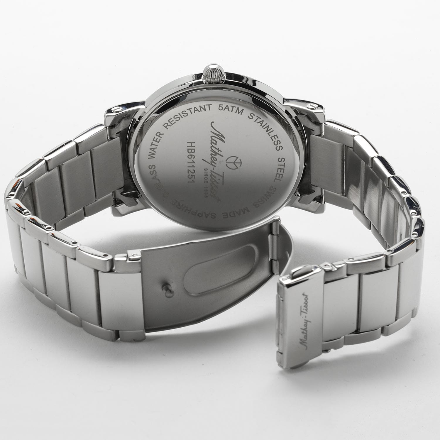 Мужские кварцевые часы Mathey-Tissot City Metal HB611251MABU — это стильное сочетание элегантности и современного дизайна. Изящный корпус выполнен из нержавеющей стали 316L серебристого цвета, диаметром 42 мм, что придаст образу элегантности и надежности. Изысканный циферблат с метками в виде штрихов придает модели особый блеск. Циферблат защищен минеральным стекломМинеральное стеклоМинеральное стекло представляет собой искусственно выращенный минерал кварца. Такое стекло отличается особой устойчивостью к повреждениям и царапинам. Уступает по некоторым качествам сапфировому стеклу. с сапфировым покрытием, обеспечивающий устойчивость к царапинам. Окошко даты находится в положении 3 часа. Часы оснащены надежным кварцевым механизмом. Стальной браслет на раскладной застёжкеРаскладная застёжкаТакой тип застёжки используется только на браслетах из металла. Она никогда не раскрывается полностью, происходит разделение на 2 и более частей. Раскладывающая застёжка снизит вероятность потери часов к минимуму., гарантирует комфортное и безопасное ношение. Класс водозащиты: 30 метров позволит защитить корпус от случайных брызг или капель дождя. Mathey-Tissot  — отличный выбор для тех, кто ценит утонченность и качество.
