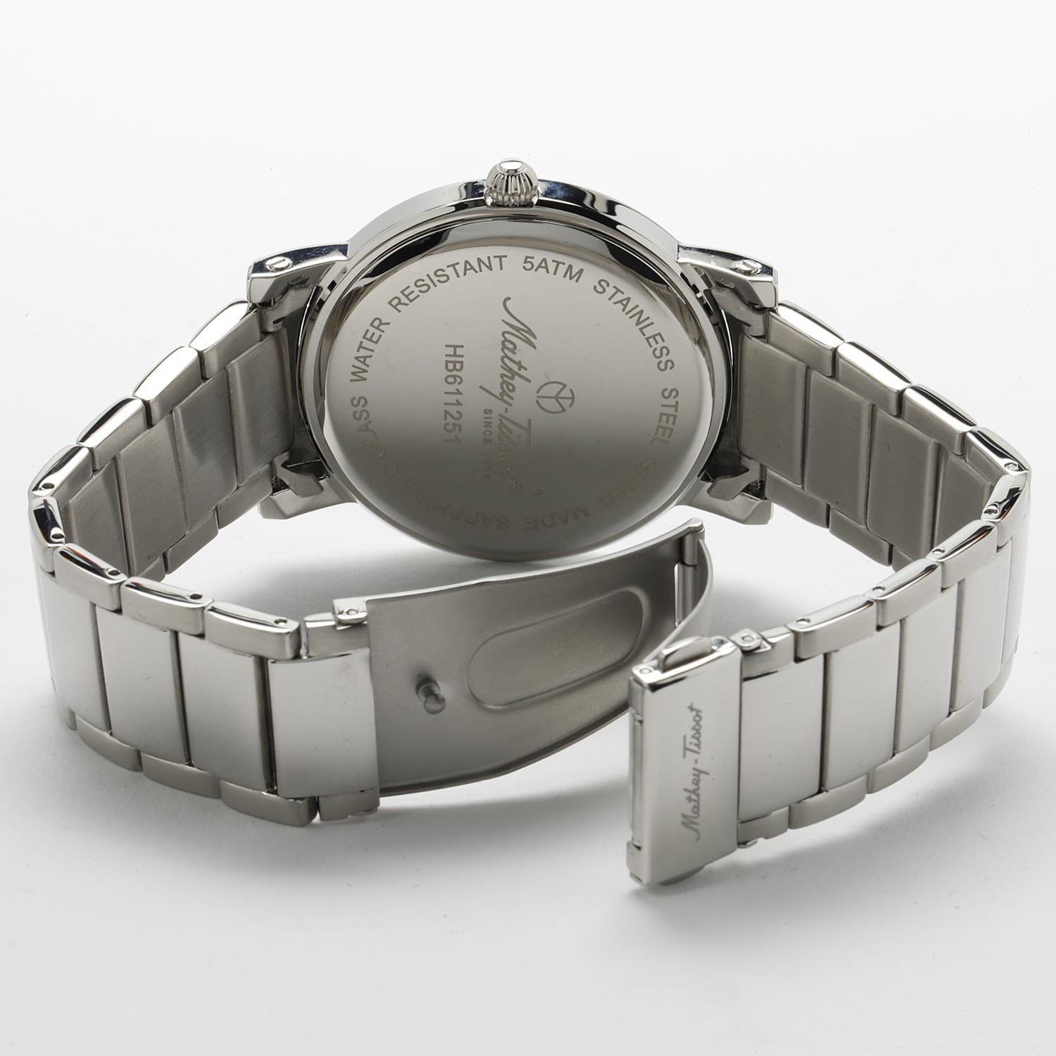Мужские кварцевые часы Mathey-Tissot City Metal HB611251MAM — это стильное сочетание элегантности и современного дизайна. Изящный корпус выполнен из нержавеющей стали 316L серебристого цвета, диаметром 42 мм, что придаст образу элегантности и надежности. Изысканный циферблат с метками в виде штрихов придает модели особый блеск. Циферблат защищен минеральным стекломМинеральное стеклоМинеральное стекло представляет собой искусственно выращенный минерал кварца. Такое стекло отличается особой устойчивостью к повреждениям и царапинам. Уступает по некоторым качествам сапфировому стеклу. с сапфировым покрытием, обеспечивающий устойчивость к царапинам. Окошко даты находится в положении 3 часа. Часы оснащены надежным кварцевым механизмом. Стальной браслет на раскладной застёжкеРаскладная застёжкаТакой тип застёжки используется только на браслетах из металла. Она никогда не раскрывается полностью, происходит разделение на 2 и более частей. Раскладывающая застёжка снизит вероятность потери часов к минимуму., гарантирует комфортное и безопасное ношение. Класс водозащиты: 30 метров позволит защитить корпус от случайных брызг или капель дождя. Mathey-Tissot  — отличный выбор для тех, кто ценит утонченность и качество.