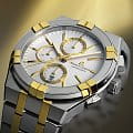Maurice Lacroix AI1118-PVY03-130-1 из коллекции AIKON — элегантные мужские кварцевые часы, сочетающие стиль и функциональность. Корпус диаметром 42 мм выполнен из нержавеющей стали и безельБезельВнешний ободок, закрепляющий стекло. В спортивных часах так называется поворотное кольцо с делениями на циферблате, выполняет роль таймера – замеряет отрезки времени на шкале. Неподвижный безель – элемент декора. Однонаправленно вращающийся безель на дайверских часах позволяет фиксировать моменты погружения и выныривания на поверхность. с жёлтым PVD-покрытиемPVDУльтратонкое покрытие наносится в технике вакуумного напыления, сочетает в себе нитрид титана особой прочности со слоем золота или оксида хрома. Несёт в себе декоративную или защитную функцию., что придаёт часам прочность и современный вид. Сапфировое стеклоСапфировое стеклоПрочный и надёжный материал из кристалла сапфира синтетического происхождения, характеризующийся особой твёрдостью и устойчивостью к царапинам и повреждениям. с двойным антибликовым покрытием защищает от царапин и обеспечивает отличную читаемость. Белый циферблат дополнен жёлтыми позолоченными метками и стрелками с люминесцентным покрытиемЛюминесцентное покрытиеПозволяет считывать показания времени в темноте. Производители наносят на стрелки, часовые индексы, безель или поверхность циферблата светонакопительный состав, дающий холодное свечение., что улучшает видимость в условиях низкой освещённости. Окошко даты расположено на отметке «6 часов». Часы оснащены швейцарским кварцевым механизмом, обеспечивающим точный и надёжный ход. Функция хронографа включает центральную секундную стрелку, 30-минутный счётчик на отметке «9 часов» и 1/10-секундный счётчик на отметке «12 часов». Водозащита до 10 ATM (100 метров) делает их подходящими для плавания. Двухцветный браслет из нержавеющей стали с жёлтым PVD-покрытиемPVDУльтратонкое покрытие наносится в технике вакуумного напыления, сочетает в себе нитрид титана особой прочности со слоем золота или оксида хрома. Несёт в себе декоративную или защитную функцию. оснащён системой быстрой замены на застёжке-бабочке с кнопкамиЗастёжка "бабочка"Такой вид застёжки дополняется предохранителями, помогающими избежать случайного раскрытия браслета. Обладают изящным исполнением. , обеспечивая комфорт и удобство. Maurice Lacroix AI1118-PVY03-130-1 — выбор для мужчин, которые ценят стиль, функциональность и высокое качество.