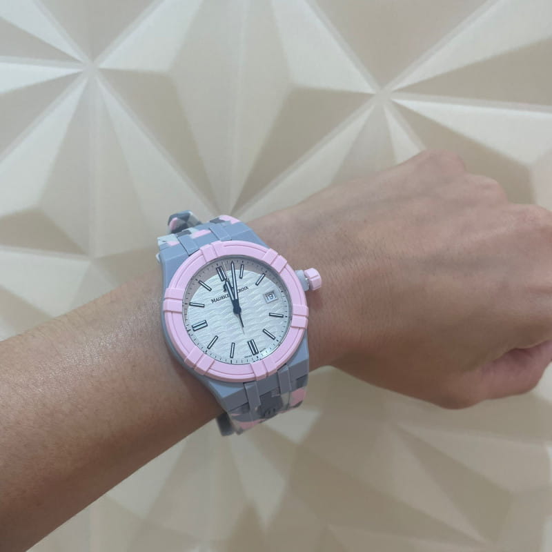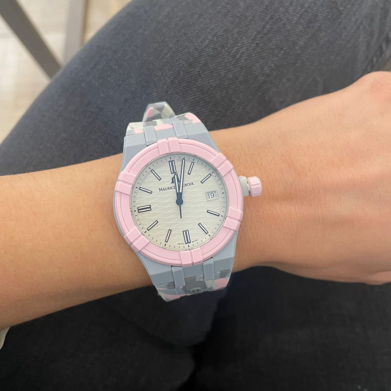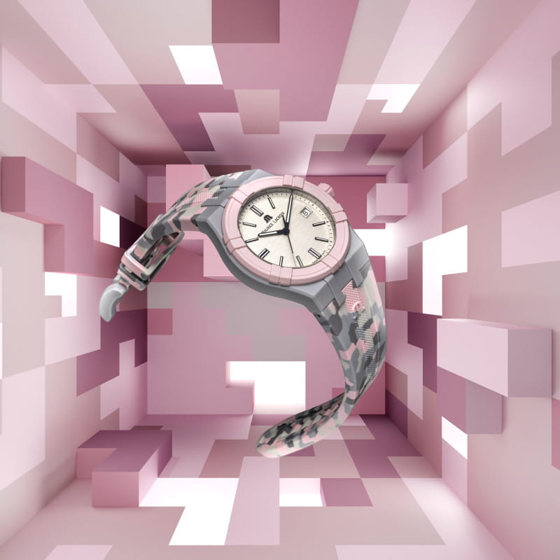 Увековечивая историю #tide, эта новая модель снова изготовлена из переработанного пластика, связанного океаном. Он оснащен черным циферблатом и соответствующим 40-миллиметровым корпусом. БезельБезельВнешний ободок, закрепляющий стекло. В спортивных часах так называется поворотное кольцо с делениями на циферблате, выполняет роль таймера – замеряет отрезки времени на шкале. Неподвижный безель – элемент декора. Однонаправленно вращающийся безель на дайверских часах позволяет фиксировать моменты погружения и выныривания на поверхность. выполнен в розовом цвете, а на камуфляжном силиконовом ремешке красуется логотип Maurice Lacroix в виде буквы "М", также выполненный в камуфляжном оттенке.