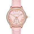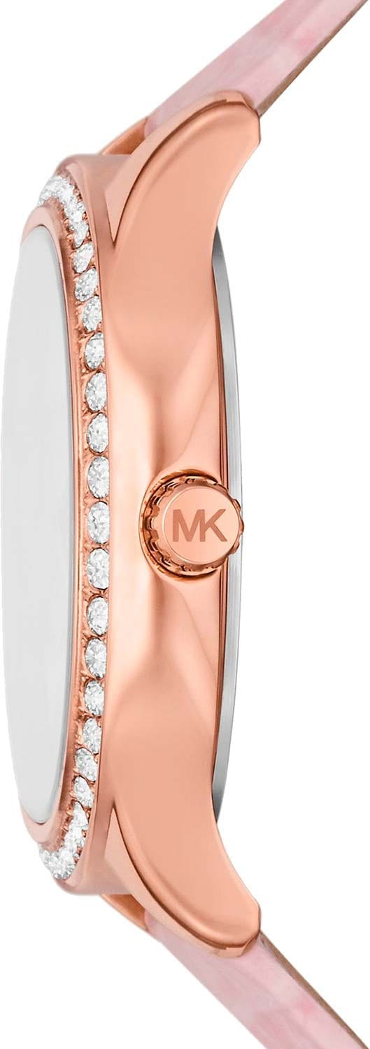 Эти часы — идеальный аксессуар, который придаст женскому образу завершенность и особый шарм. Женские американские часы Michael Kors Sage MK4820 имеют кварцевый механизм с высокой точностью. Корпус и безельБезельВнешний ободок, закрепляющий стекло. В спортивных часах так называется поворотное кольцо с делениями на циферблате, выполняет роль таймера – замеряет отрезки времени на шкале. Неподвижный безель – элемент декора. Однонаправленно вращающийся безель на дайверских часах позволяет фиксировать моменты погружения и выныривания на поверхность.часов изготовлены из нержавеющей стали с розово-золотистым PVD-покрытиемPVDУльтратонкое покрытие наносится в технике вакуумного напыления, сочетает в себе нитрид титана особой прочности со слоем золота или оксида хрома. Несёт в себе декоративную или защитную функцию.. Перламутровый розовый циферблат и безельБезельВнешний ободок, закрепляющий стекло. В спортивных часах так называется поворотное кольцо с делениями на циферблате, выполняет роль таймера – замеряет отрезки времени на шкале. Неподвижный безель – элемент декора. Однонаправленно вращающийся безель на дайверских часах позволяет фиксировать моменты погружения и выныривания на поверхность. украшены кристаллами. Циферблат с метками в виде римских цифр и штрихов защищен минеральным стекломМинеральное стеклоМинеральное стекло представляет собой искусственно выращенный минерал кварца. Такое стекло отличается особой устойчивостью к повреждениям и царапинам. Уступает по некоторым качествам сапфировому стеклу., что обеспечивает надежную защиту от царапин и повреждений. Секундная стрелка вынесена на отдельный циферблат, обрамленный кристаллами, что придает часам уникальный и стильный вид. Люминесцентное покрытиеЛюминесцентное покрытиеПозволяет считывать показания времени в темноте. Производители наносят на стрелки, часовые индексы, безель или поверхность циферблата светонакопительный состав, дающий холодное свечение. на стрелках обеспечивает отличную видимость в темноте. Класс водозащиты: 50 метров, позволит защитить корпус от случайных брызг или капель дождя. Удобный кожаный розовый ремешок с тиснением под кожу крокодила с классической застежкой обеспечивает надежную фиксацию на запястье и легкость в надевании и снятии. Эти часы станут отличным дополнением к любому наряду, подчеркивая индивидуальность и стиль их обладательницы.