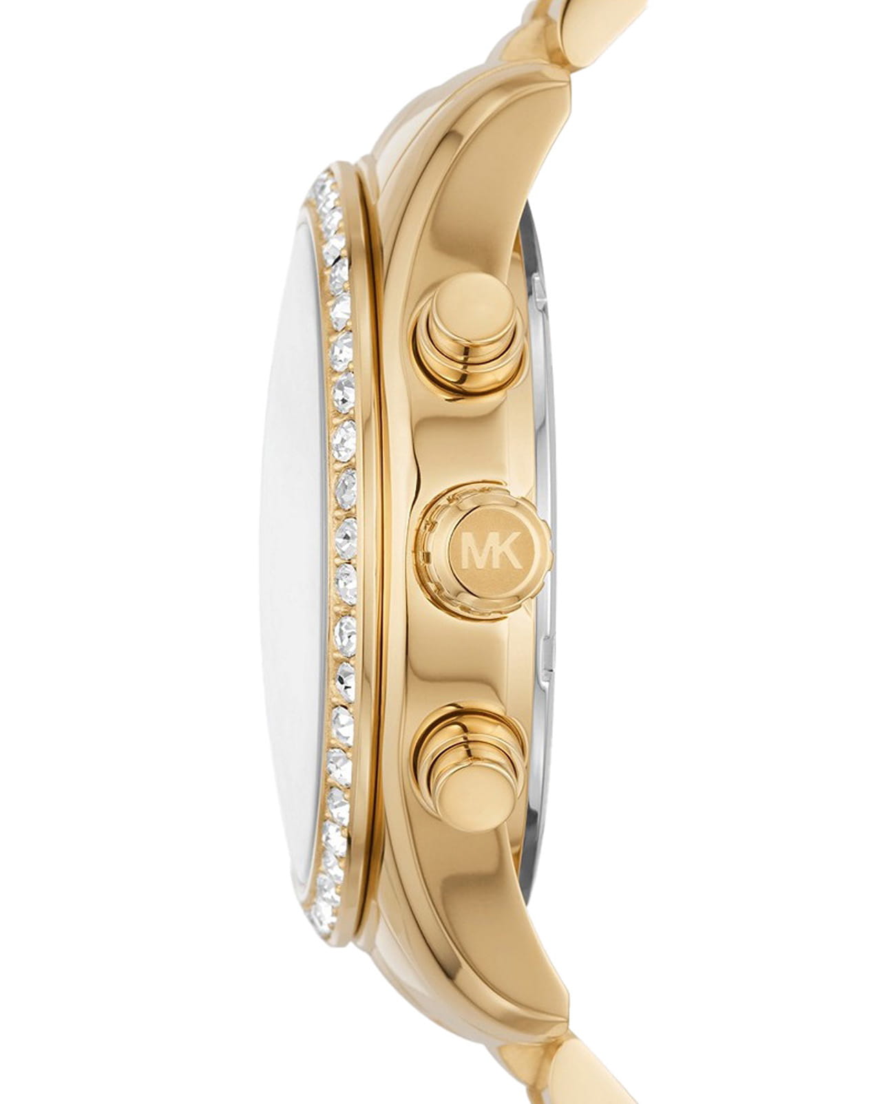 Женские американские часы-хронографХронографФункция позволяет измерять отрезки времени с особой точностью: часы, минуты, секунды. Верным признаком хронографа является наличие на циферблате 3 дополнительных окошек-счётчиков. с секундомеромСекундомерСекундоме́р — прибор, способный измерять интервалы времени с точностью до долей секунды. и с минеральным стекломМинеральное стеклоМинеральное стекло представляет собой искусственно выращенный минерал кварца. Такое стекло отличается особой устойчивостью к повреждениям и царапинам. Уступает по некоторым качествам сапфировому стеклу. Michael Kors Lexington MK7241, кварцевый механизм с высокой точностью. Корпус часов изготовлен из нержавеющей стали с PVD-покрытиемPVDУльтратонкое покрытие наносится в технике вакуумного напыления, сочетает в себе нитрид титана особой прочности со слоем золота или оксида хрома. Несёт в себе декоративную или защитную функцию.. БезельБезельВнешний ободок, закрепляющий стекло. В спортивных часах так называется поворотное кольцо с делениями на циферблате, выполняет роль таймера – замеряет отрезки времени на шкале. Неподвижный безель – элемент декора. Однонаправленно вращающийся безель на дайверских часах позволяет фиксировать моменты погружения и выныривания на поверхность. украшен кристаллами. Три дополнительных индикатора. Метки в виде штрихов и римских цифр. Окошко даты находится в положении 6 часов. Класс водозащиты: 100 метров, позволит плавать, нырять и заниматься другими водными видами спорта. Стальной браслет с PVD-покрытиемPVDУльтратонкое покрытие наносится в технике вакуумного напыления, сочетает в себе нитрид титана особой прочности со слоем золота или оксида хрома. Несёт в себе декоративную или защитную функцию. на раскладной застёжкеРаскладная застёжкаТакой тип застёжки используется только на браслетах из металла. Она никогда не раскрывается полностью, происходит разделение на 2 и более частей. Раскладывающая застёжка снизит вероятность потери часов к минимуму..
