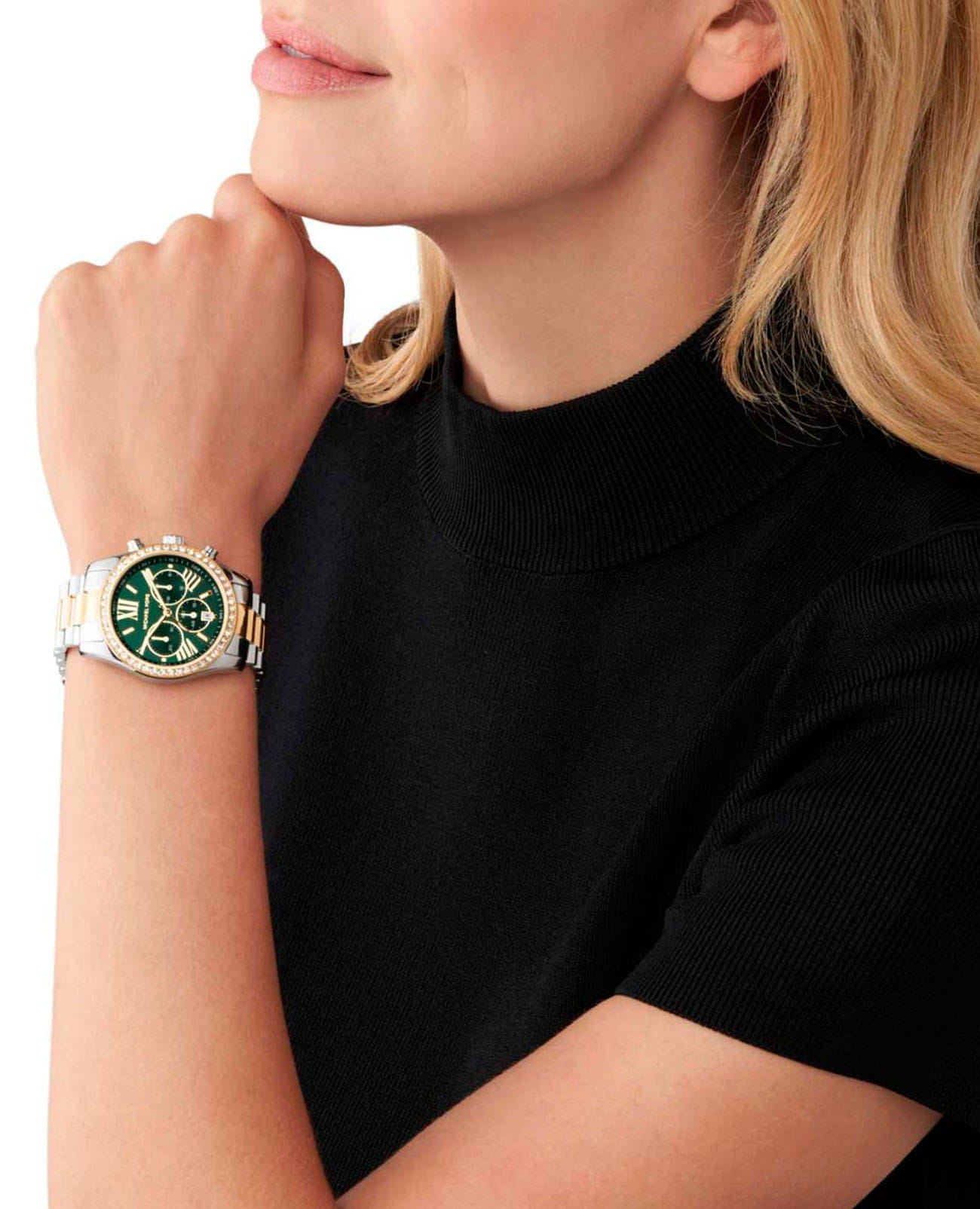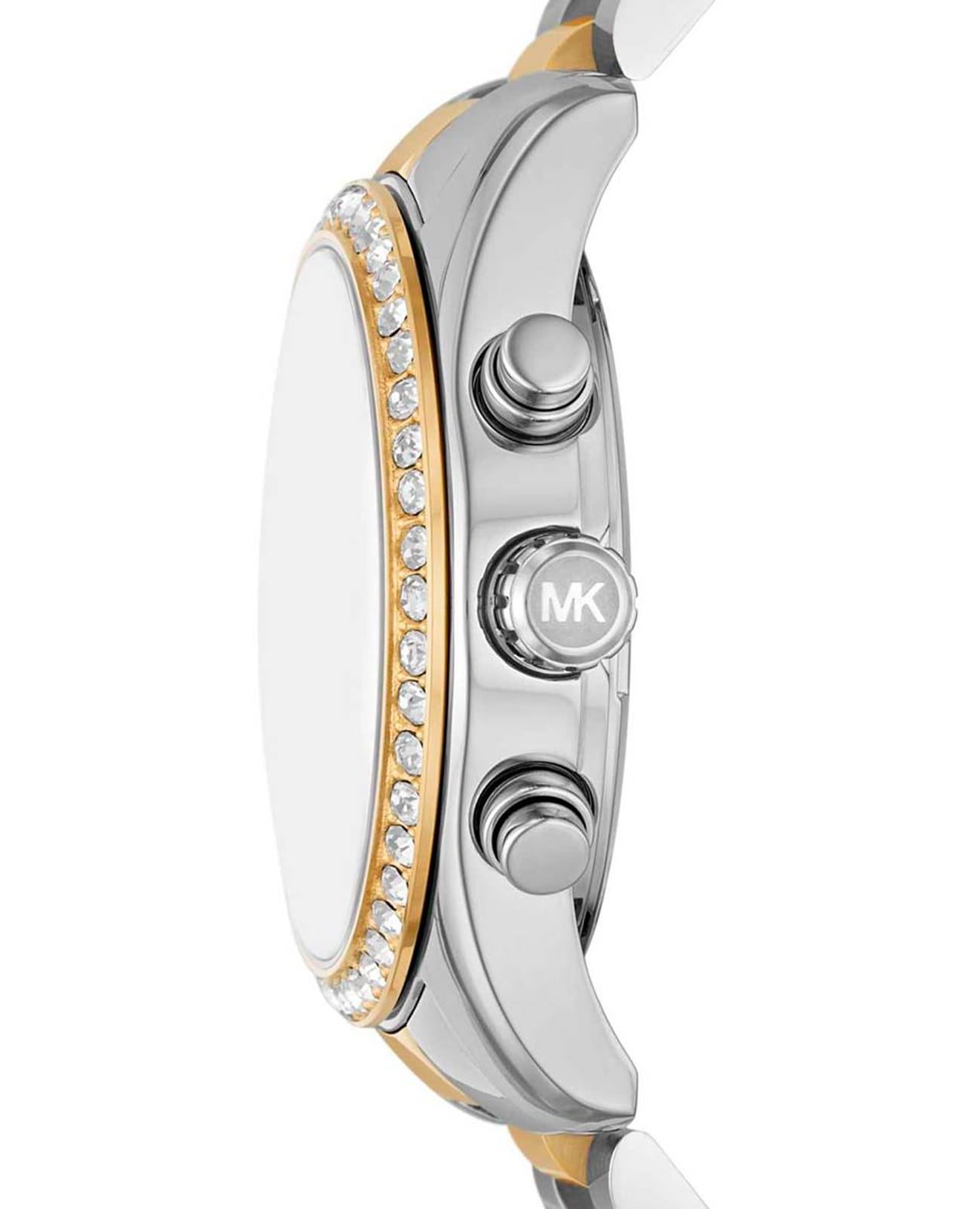 Женские американские часы-хронографХронографФункция позволяет измерять отрезки времени с особой точностью: часы, минуты, секунды. Верным признаком хронографа является наличие на циферблате 3 дополнительных окошек-счётчиков. с секундомеромСекундомерСекундоме́р — прибор, способный измерять интервалы времени с точностью до долей секунды. и с минеральным стекломМинеральное стеклоМинеральное стекло представляет собой искусственно выращенный минерал кварца. Такое стекло отличается особой устойчивостью к повреждениям и царапинам. Уступает по некоторым качествам сапфировому стеклу. Michael Kors Lexington MK7303, кварцевый механизм с высокой точностью. Корпус часов изготовлен из нержавеющей стали. БезельБезельВнешний ободок, закрепляющий стекло. В спортивных часах так называется поворотное кольцо с делениями на циферблате, выполняет роль таймера – замеряет отрезки времени на шкале. Неподвижный безель – элемент декора. Однонаправленно вращающийся безель на дайверских часах позволяет фиксировать моменты погружения и выныривания на поверхность. с PVD-покрытиемPVDУльтратонкое покрытие наносится в технике вакуумного напыления, сочетает в себе нитрид титана особой прочности со слоем золота или оксида хрома. Несёт в себе декоративную или защитную функцию. украшен кристаллами. Три дополнительных индикатора. Метки в виде штрихов и римских цифр. Окошко даты находится в положении 6 часов. Класс водозащиты: 100 метров, позволит плавать, нырять и заниматься другими водными видами спорта. Стальной браслет с частичным PVD-покрытиемPVDУльтратонкое покрытие наносится в технике вакуумного напыления, сочетает в себе нитрид титана особой прочности со слоем золота или оксида хрома. Несёт в себе декоративную или защитную функцию. на раскладной застёжкеРаскладная застёжкаТакой тип застёжки используется только на браслетах из металла. Она никогда не раскрывается полностью, происходит разделение на 2 и более частей. Раскладывающая застёжка снизит вероятность потери часов к минимуму..