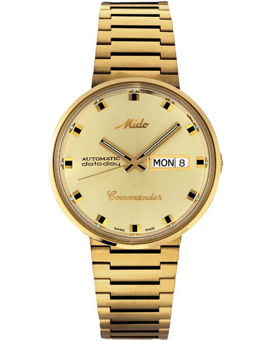 Циферблат с фирменным логотипом Mido 1950-х годов украшен накладными индексами и стрелками с люминесцентным покрытиемЛюминесцентное покрытиеПозволяет считывать показания времени в темноте. Производители наносят на стрелки, часовые индексы, безель или поверхность циферблата светонакопительный состав, дающий холодное свечение., обеспечивающим читаемость даже в условиях слабого освещения. На «3 часах» расположено двойное окошко календаря — день недели и дата. Стальной браслет с PVD-покрытиемPVDУльтратонкое покрытие наносится в технике вакуумного напыления, сочетает в себе нитрид титана особой прочности со слоем золота или оксида хрома. Несёт в себе декоративную или защитную функцию. на раскладной застёжкеРаскладная застёжкаТакой тип застёжки используется только на браслетах из металла. Она никогда не раскрывается полностью, происходит разделение на 2 и более частей. Раскладывающая застёжка снизит вероятность потери часов к минимуму..