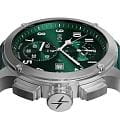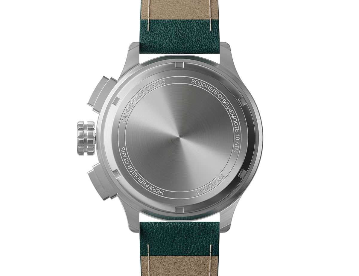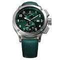 Мужские кварцевые часы — это стильный и функциональный аксессуар с хронографом. Корпус диаметром 44 мм выполнен из нержавеющей стали 316L с матовой полировкой, включая безельБезельВнешний ободок, закрепляющий стекло. В спортивных часах так называется поворотное кольцо с делениями на циферблате, выполняет роль таймера – замеряет отрезки времени на шкале. Неподвижный безель – элемент декора. Однонаправленно вращающийся безель на дайверских часах позволяет фиксировать моменты погружения и выныривания на поверхность., кнопки и заводную головку. Циферблат зелёного цвета оформлен индексами и стрелками. Стрелки и метки с люминесцентным покрытиемЛюминесцентное покрытиеПозволяет считывать показания времени в темноте. Производители наносят на стрелки, часовые индексы, безель или поверхность циферблата светонакопительный состав, дающий холодное свечение. Super-LumiNova, обеспечивающим хорошую читаемость в темноте. Циферблат защищён сапфировым стекломСапфировое стеклоПрочный и надёжный материал из кристалла сапфира синтетического происхождения, характеризующийся особой твёрдостью и устойчивостью к царапинам и повреждениям.. Механизм — швейцарский кварцевый калибр Ronda 3520.D с функциями хронографаХронографФункция позволяет измерять отрезки времени с особой точностью: часы, минуты, секунды. Верным признаком хронографа является наличие на циферблате 3 дополнительных окошек-счётчиков. и секундомераСекундомерСекундоме́р — прибор, способный измерять интервалы времени с точностью до долей секунды.. Часы оснащены кожаным ремешком зелёного цвета с классической пряжкой. Водонепроницаемость 100 м позволяет использовать часы для плавания и повседневного ношения. Идеальный выбор для тех, кто ценит точность, качество и выразительный дизайн.