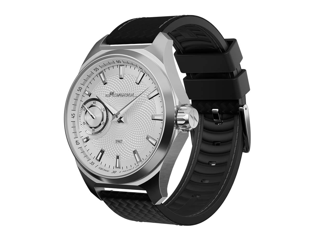 Мужские механические часы с ручным подзаводом — это аксессуар от легендарного бренда «МОЛНИЯ», созданный на Челябинском часовом заводе. Корпус диаметром 42 мм выполнен из нержавеющей стали 316L с зеркальной полировкой. БезельБезельВнешний ободок, закрепляющий стекло. В спортивных часах так называется поворотное кольцо с делениями на циферблате, выполняет роль таймера – замеряет отрезки времени на шкале. Неподвижный безель – элемент декора. Однонаправленно вращающийся безель на дайверских часах позволяет фиксировать моменты погружения и выныривания на поверхность. также выполнен из стали с зеркальной отделкой. Циферблат белого цвета оформлен индексами и стрелками. Малая секундная стрелка вынесена на позицию 9 часов. Стрелки и метки с люминесцентным покрытиемЛюминесцентное покрытиеПозволяет считывать показания времени в темноте. Производители наносят на стрелки, часовые индексы, безель или поверхность циферблата светонакопительный состав, дающий холодное свечение. Super-LumiNova, обеспечивающим хорошую читаемость в темноте. Циферблат защищён сапфировым стекломСапфировое стеклоПрочный и надёжный материал из кристалла сапфира синтетического происхождения, характеризующийся особой твёрдостью и устойчивостью к царапинам и повреждениям. с антибликовым покрытиемАнтибликовое покрытиеСлой оксида металла в 0,13-0,3 микрон, благодаря которому стекло часов не бликует и не отражает свет. Антибликовое покрытие уменьшает отражение света в 10 раз, обеспечивая отличную читаемость показателей циферблата.. Механизм — мануфактурный калибр 3603, собранный вручную, с запасом хода до 40 часов. Прозрачная задняя крышка позволяет наблюдать за работой механизма. Часы оснащены силиконовым ремешком чёрного цвета с классической пряжкой, а также системой быстрой замены. Водонепроницаемость 100 м позволяет использовать часы для плавания и повседневного ношения. Идеальный выбор для тех, кто ценит российское качество и традиции.