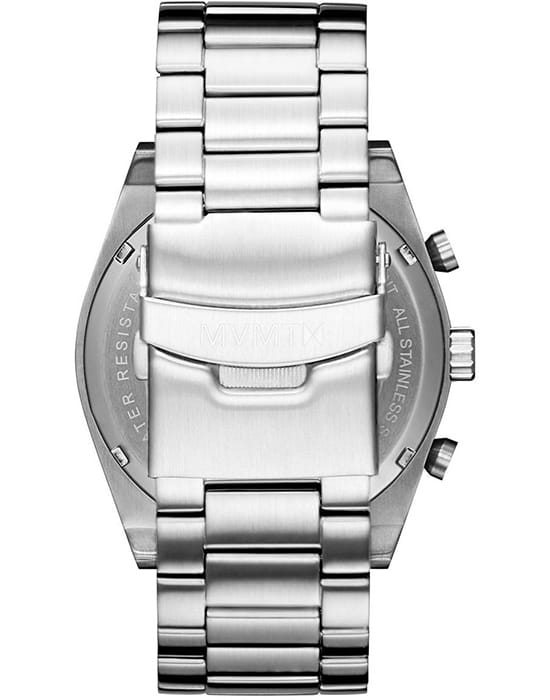 Мужские кварцевые часы-хронографХронографФункция позволяет измерять отрезки времени с особой точностью: часы, минуты, секунды. Верным признаком хронографа является наличие на циферблате 3 дополнительных окошек-счётчиков. с секундомеромСекундомерСекундоме́р — прибор, способный измерять интервалы времени с точностью до долей секунды. MVMT 28000046-D – лаконичная красота и изысканная элегантность. Оригинальная модель с классическим оформлением станет превосходным завершением образа, наделив его индивидуальным характером. Корпус выполнен из нержавеющей стали, диаметром 44 мм и толщиной 10,5 мм, что обеспечивает долговечность и утончённый внешний вид. Закаленное минеральное стеклоМинеральное стеклоМинеральное стекло представляет собой искусственно выращенный минерал кварца. Такое стекло отличается особой устойчивостью к повреждениям и царапинам. Уступает по некоторым качествам сапфировому стеклу. защищает циферблат от царапин. Стальной браслет на раскладной застёжке с фиксаторомРаскладная застёжкаТакой тип застёжки используется только на браслетах из металла. Она никогда не раскрывается полностью, происходит разделение на 2 и более частей. Раскладывающая застёжка снизит вероятность потери часов к минимуму. обеспечивает комфортное ношение. Водозащита 50 метров позволит защитить корпус от случайных брызг или капель дождя. Индикатор 24-х часов вынесен на отдельный циферблат. Рифленая заводная головка с защитой. Это аксессуар для мужчины, который ценит классический стиль и функциональность.